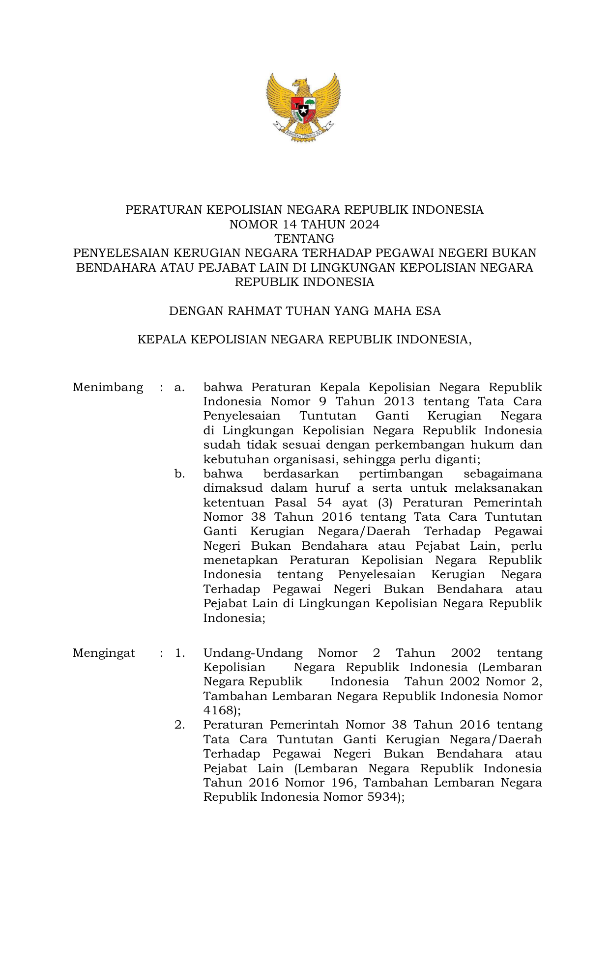 PERBAN Nomor 14 Tahun 2024 | Peraturan Badan Nomor 14 Tahun 2024 tentang PENYELESAIAN KERUGIAN NEGARA TERHADAP PEGAWAI NEGERI BUKAN BENDAHARA ATAU PEJABAT LAIN DI LINGKUNGAN KEPOLISIAN NEGARA REPUBLIK INDONESIA