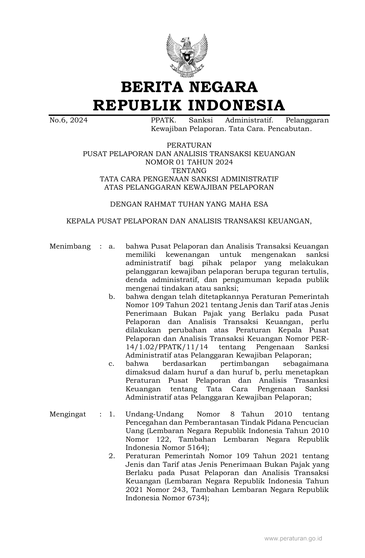 PERBAN Nomor 01 Tahun 2024 | Peraturan Badan Nomor 01 Tahun 2024 tentang TATA CARA PENGENAAN SANKSI ADMINISTRATIF ATAS PELANGGARAN KEWAJIBAN PELAPORAN