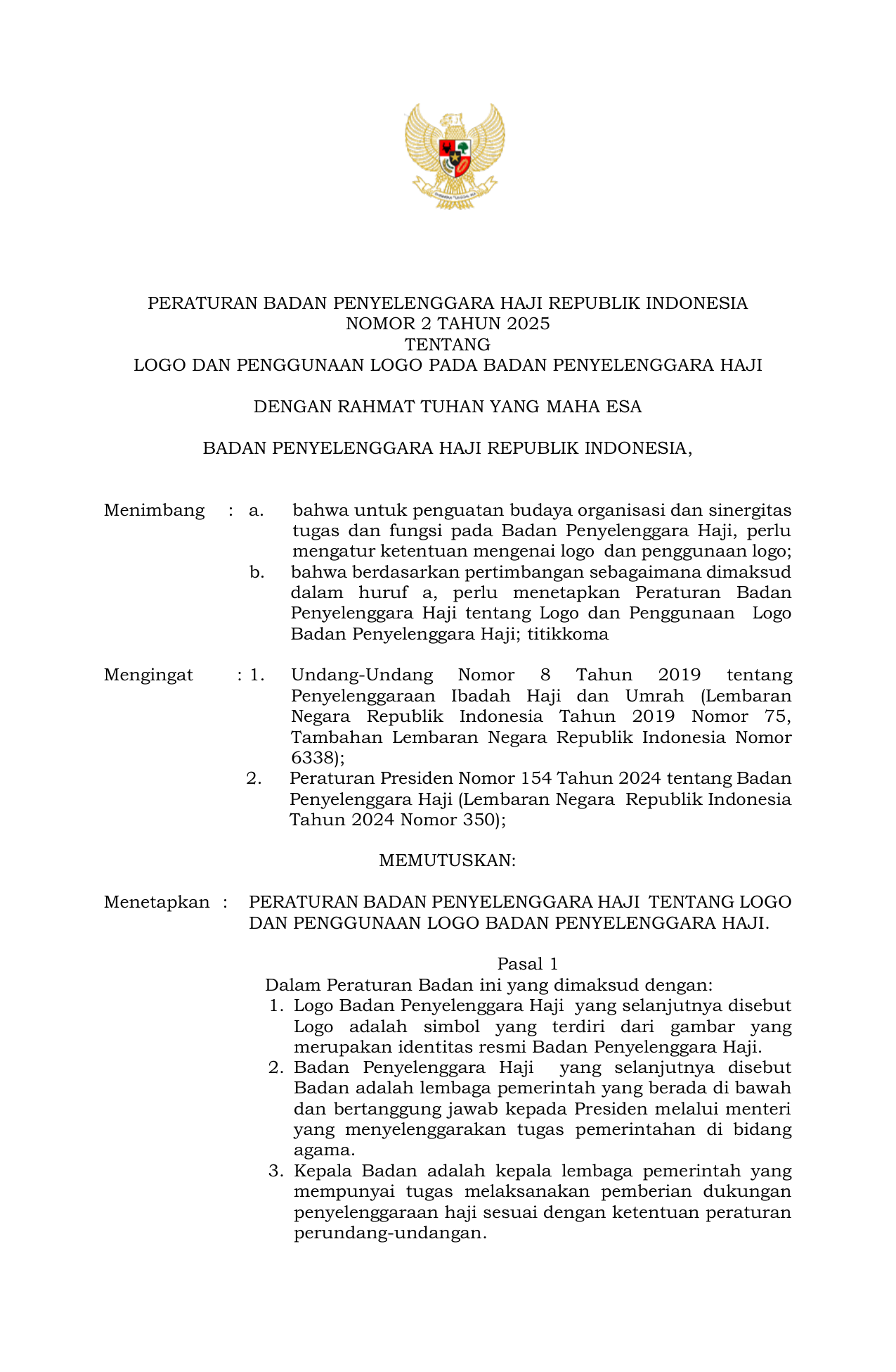 PERBAN Nomor 2 Tahun 2025 | Peraturan Badan Nomor 2 Tahun 2025 tentang LOGO DAN PENGGUNAAN LOGO PADA BADAN PENYELENGGARA HAJI