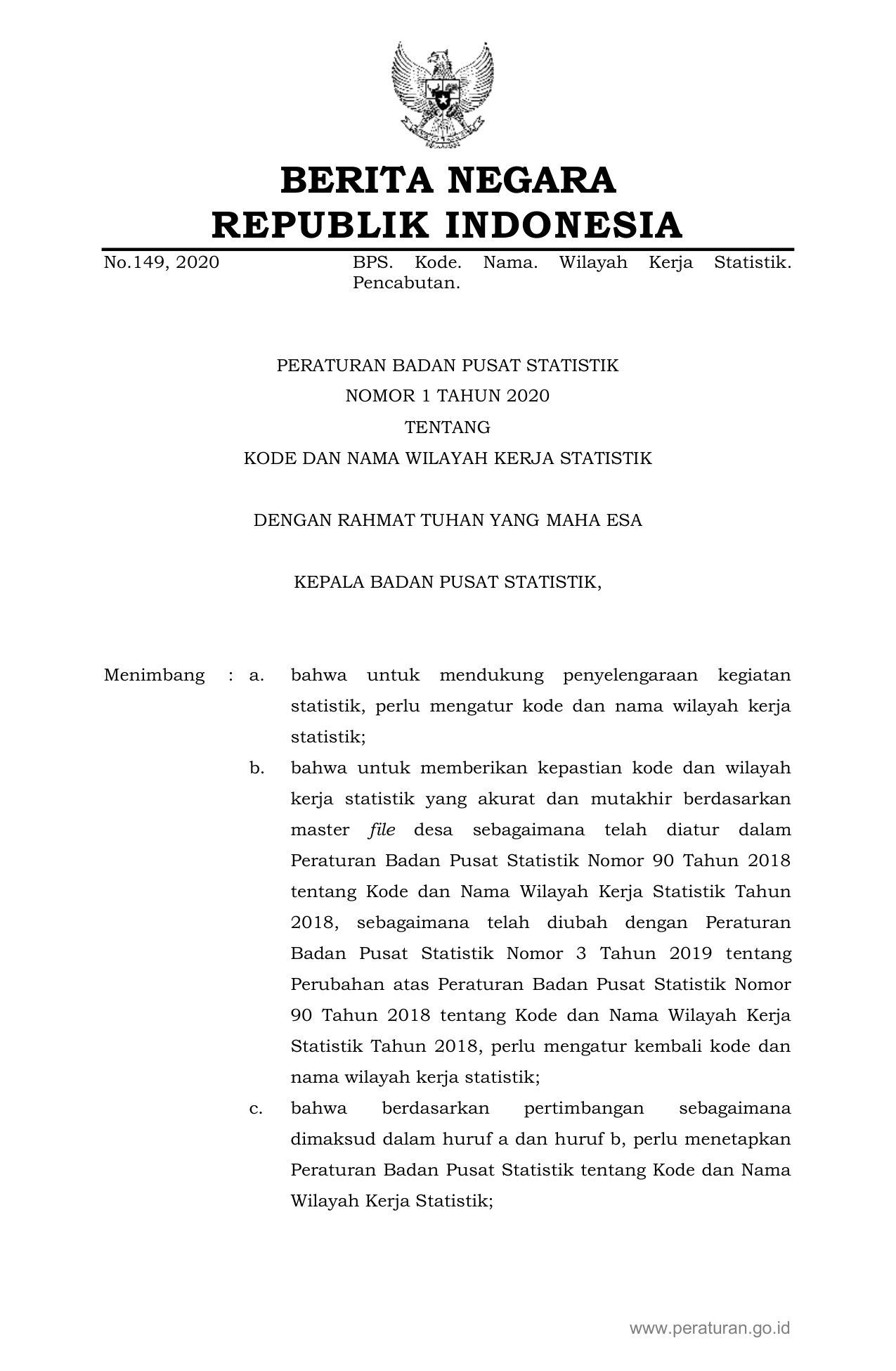 PERBAN Nomor 1 Tahun 2020 | Peraturan Badan Nomor 1 Tahun 2020 tentang KODE DAN NAMA WILAYAH KERJA STATISTIK
