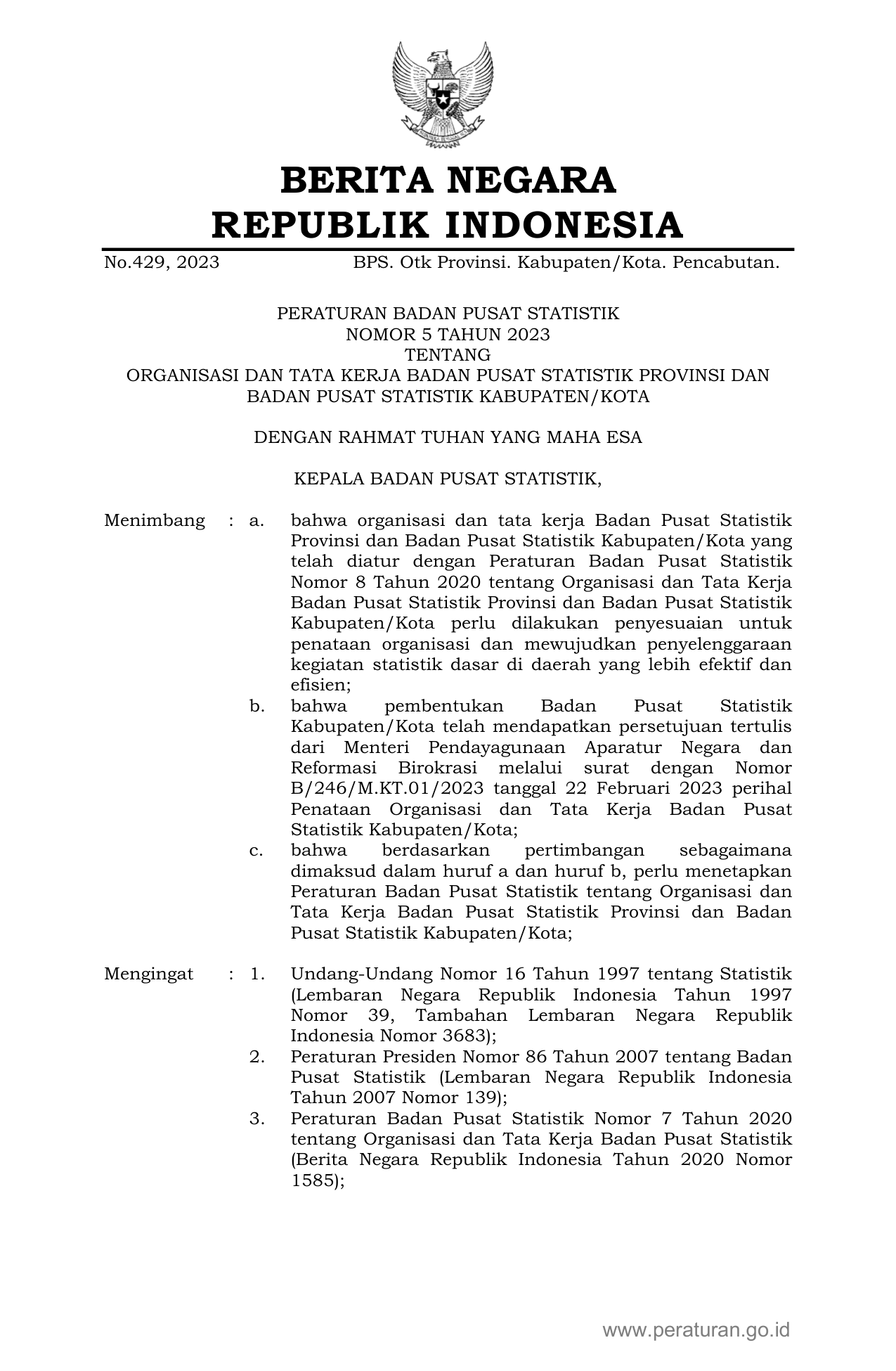 PERBAN Nomor 5 Tahun 2023 | Peraturan Badan Nomor 5 Tahun 2023 tentang ORGANISASI DAN TATA KERJA BADAN PUSAT STATISTIK PROVINSI DAN BADAN PUSAT STATISTIK KABUPATEN/KOTA