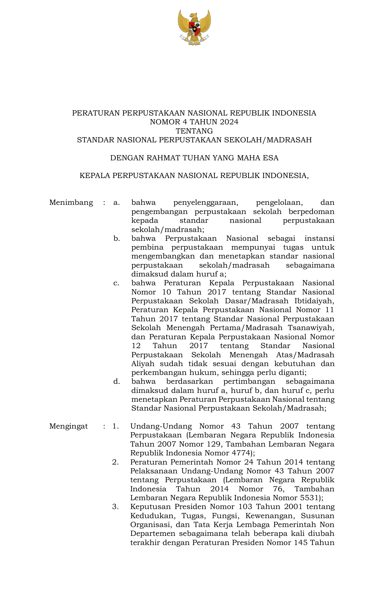 PERBAN Nomor 4 Tahun 2024 | Peraturan Badan Nomor 4 Tahun 2024 tentang STANDAR NASIONAL PERPUSTAKAAN SEKOLAH/MADRASAH