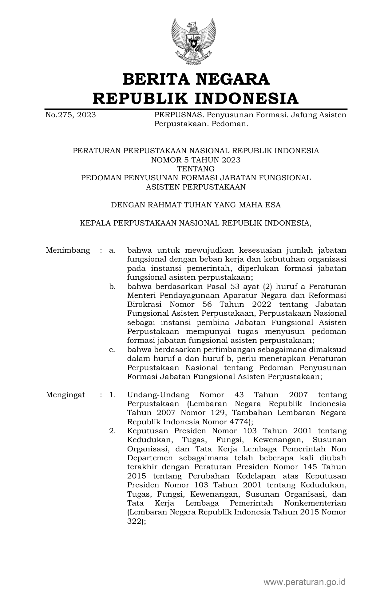 PERBAN Nomor 5 Tahun 2023 | Peraturan Badan Nomor 5 Tahun 2023 tentang PEDOMAN PENYUSUNAN FORMASI JABATAN FUNGSIONAL ASISTEN PERPUSTAKAAN
