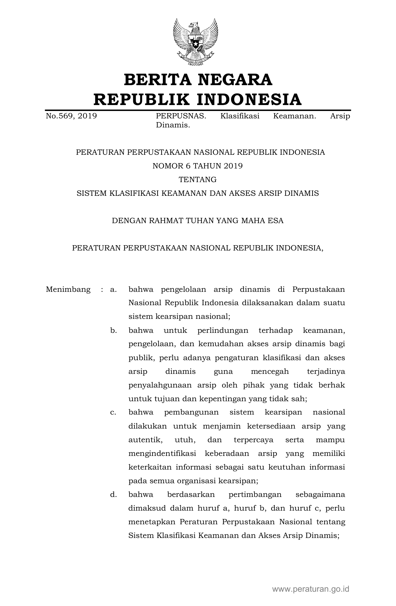 PERBAN Nomor 6 Tahun 2019 | Peraturan Badan Nomor 6 Tahun 2019 tentang SISTEM KLASIFIKASI KEAMANAN DAN AKSES ARSIP DINAMIS