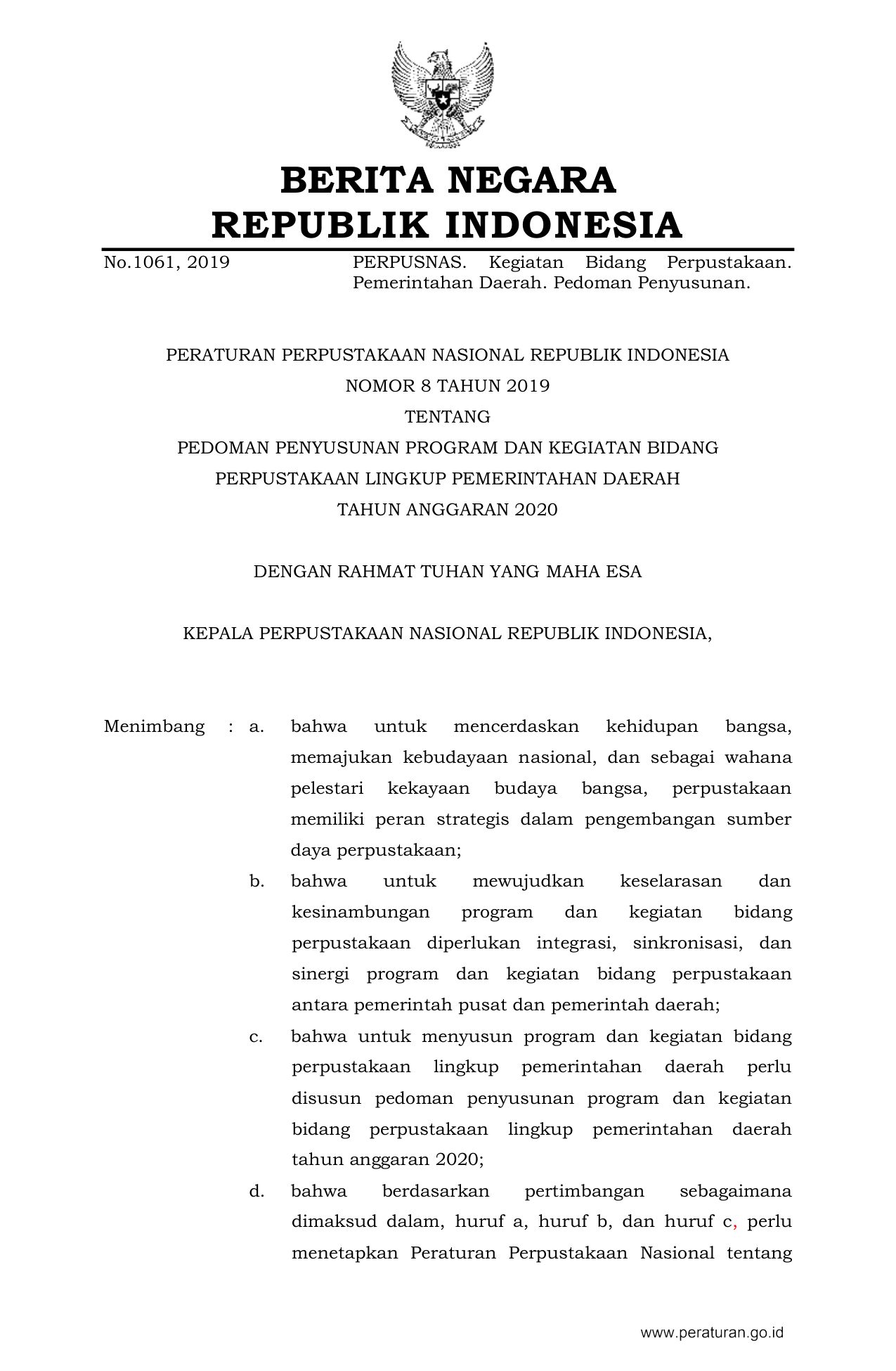 PERBAN Nomor 8 Tahun 2019 | Peraturan Badan Nomor 8 Tahun 2019 tentang PEDOMAN PENYUSUNAN PROGRAM DAN KEGIATAN BIDANG PERPUSTAKAAN LINGKUP PEMERINTAHAN DAERAH TAHUN ANGGARAN 2020