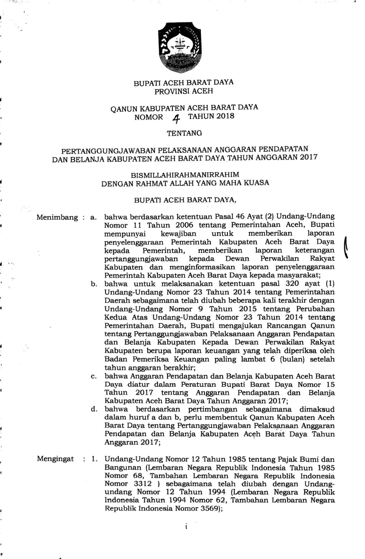 PERDA Nomor 4 Tahun 2018 | Peraturan Daerah Nomor 4 Tahun 2018 tentang PERTANGGUNGJAWABAN PELAKSANMN ANGGARAN PENDAPATANDAN BELANJA KABUPATEN ACEH BARAT DAYA TAHUN ANGGARAN 2017