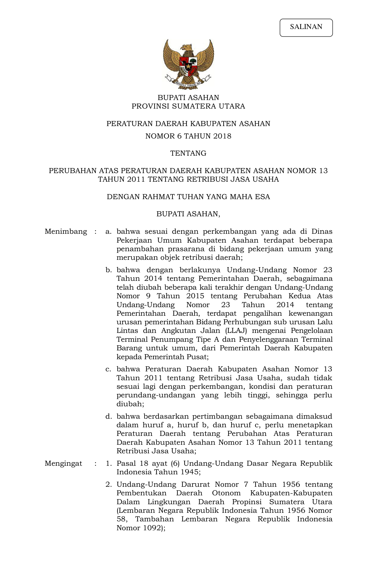 PERDA Nomor 6 Tahun 2018 | Peraturan Daerah Nomor 6 Tahun 2018 tentang PERUBAHAN ATAS PERATURAN DAERAH KABUPATEN ASAHAN NOMOR 13 TAHUN 2011 TENTANGRETRIBUSIJASA USAHA