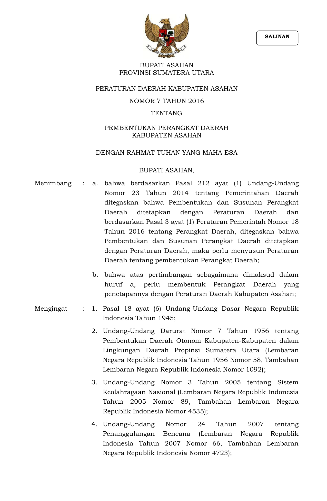 Dengan Peraturan Daerah ini dibentuk Perangkat Daerah Kabupaten Asahan sebagai berikut: