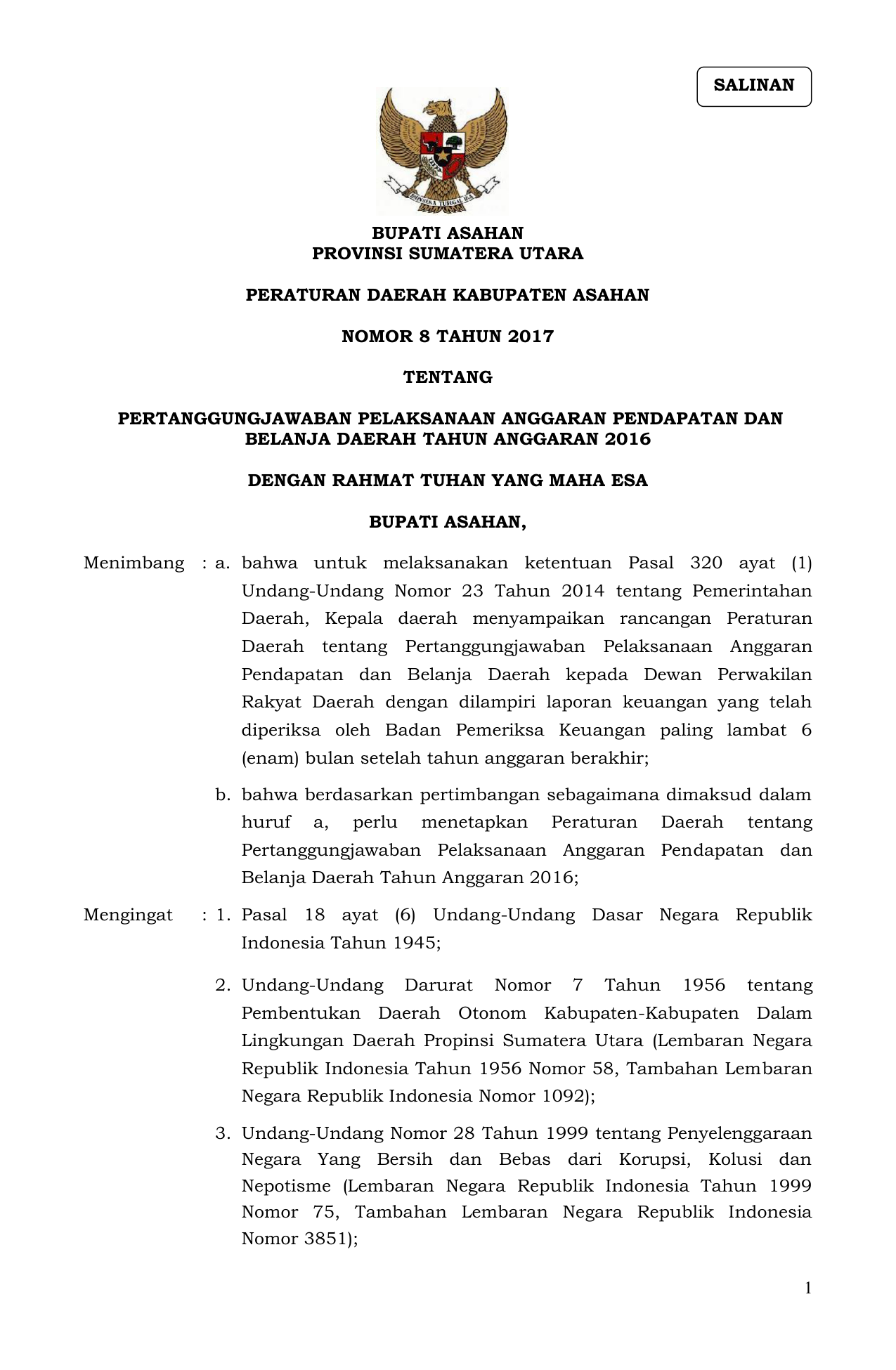 PERDA Nomor 8 Tahun 2017 | Peraturan Daerah Nomor 8 Tahun 2017 tentang PERTANGGUNGJAWABAN PELAKSANAAN ANGGARAN PENDAPATAN DAN BELANJA DAERAHTAHUN ANGGARAN 2016
