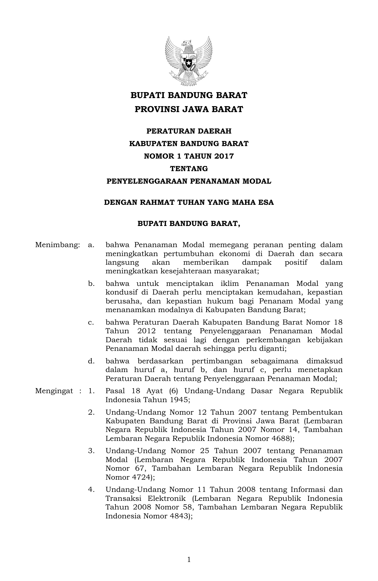 PERDA Nomor 1 Tahun 2017 | Peraturan Daerah Nomor 1 Tahun 2017 tentang PENYELENGGARAAN PENANAMAN MODAL