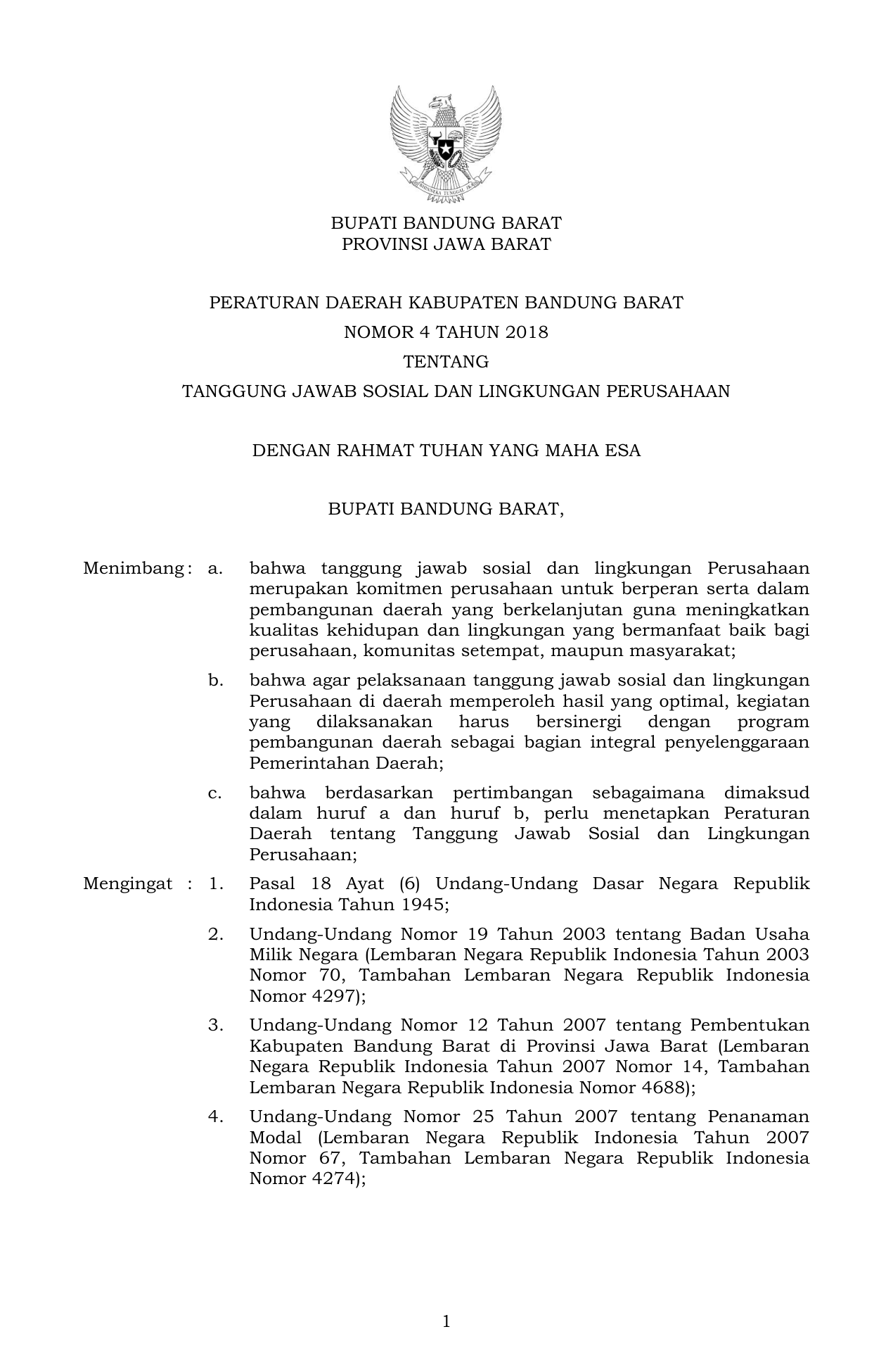 PERDA Nomor 4 Tahun 2018 | Peraturan Daerah Nomor 4 Tahun 2018 tentang TANGGUNG JAWAB SOSIAL DAN LINGKUNGAN PERUSAHAAN