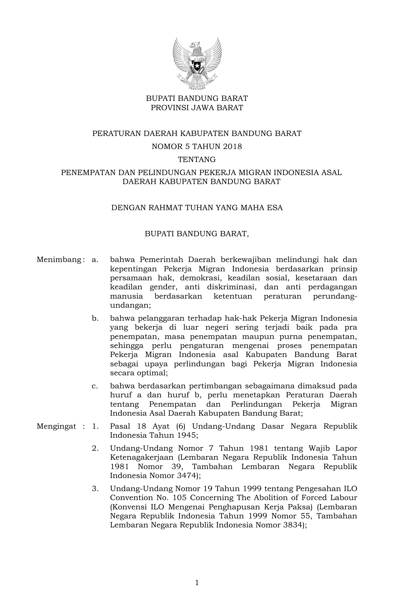 PERDA Nomor 5 Tahun 2018 | Peraturan Daerah Nomor 5 Tahun 2018 tentang PENEMPATAN DAN PELINDUNGAN PEKERJA MIGRAN INDONESIA ASALDAERAH KABUPATEN BANDUNG BARAT