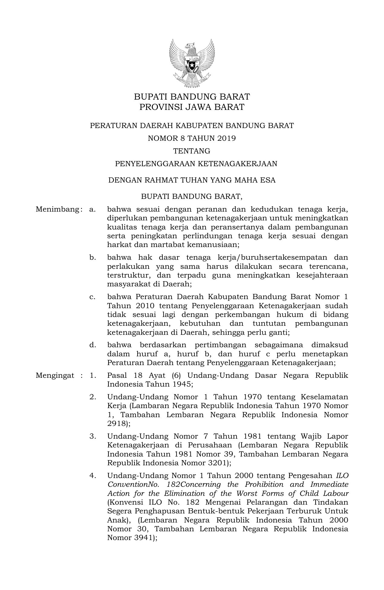 PERDA Nomor 8 Tahun 2019 | Peraturan Daerah Nomor 8 Tahun 2019 tentang PENYELENGGARAAN KETENAGAKERJAAN