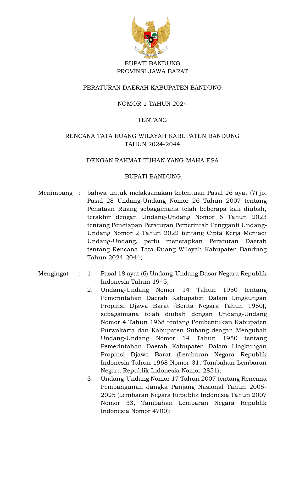 PERDA Nomor 1 Tahun 2024 | Peraturan Daerah Nomor 1 Tahun 2024 tentang Rencana Tata Ruang Wilayah Kabupaten Bandung Tahun 2024-2044