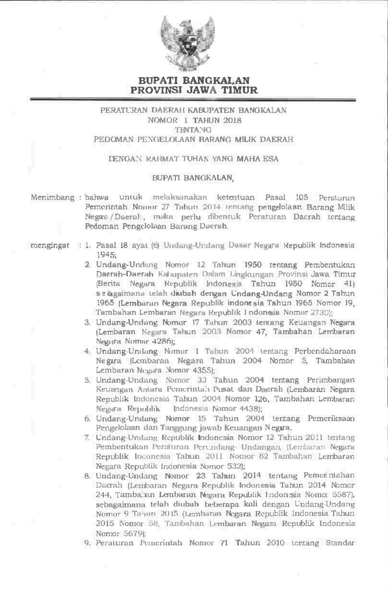 PERDA Nomor 1 Tahun 2018 | Peraturan Daerah Nomor 1 Tahun 2018 tentang PEDOMAN PENGELOL.AAN BARANG MILIK DAERAH (a) PEDOMAN PENGELOLAAN BARANG MILIK DAERAH (b) PEDOMAN PEN\GELOLAAN BARANG MILIK DAERAH (c) PEDOMAN PEN\GELOLAAN BARANG MILIK DAERAH (d)