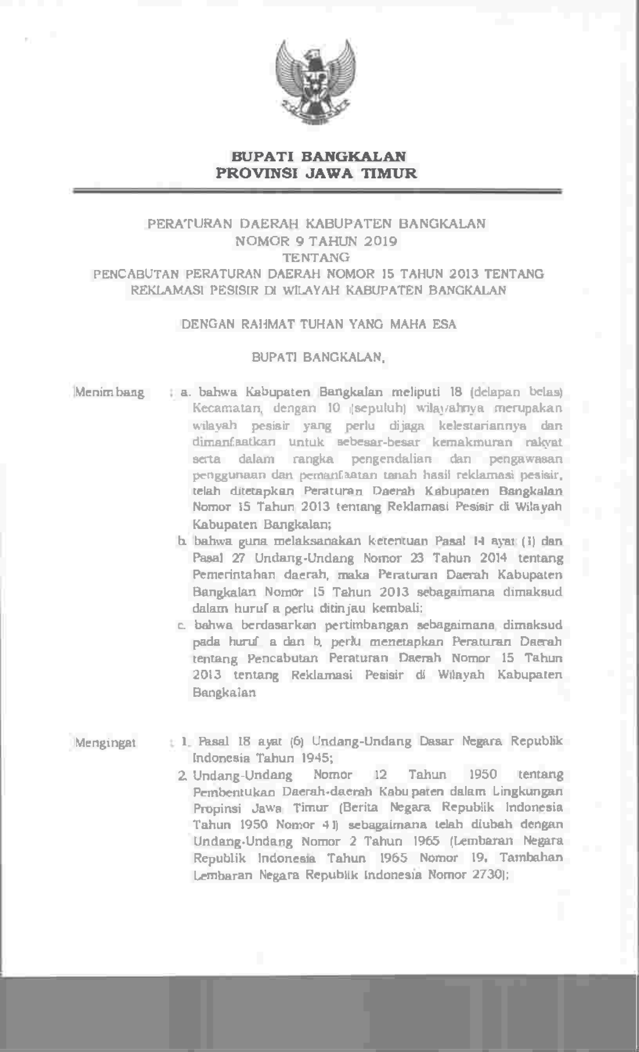 PERDA Nomor 9 Tahun 2019 | Peraturan Daerah Nomor 9 Tahun 2019 tentang PENCABUTAN PERATURAN DAERAH NOMOR I5 TAHUN 2013 TENTANG REKLAMASI PESISIR DI WILAYAH KABUPATEN BANGKALAN