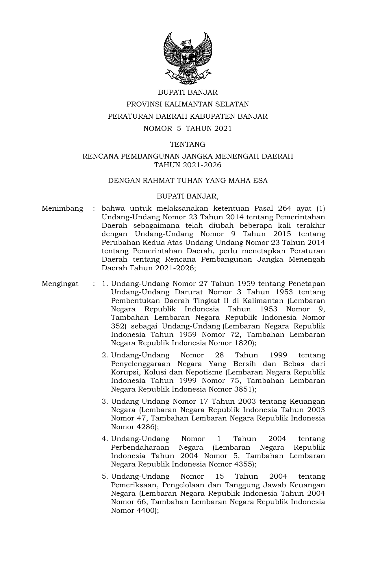 PERDA Nomor 5 Tahun 2021 | Peraturan Daerah Nomor 5 Tahun 2021 tentang RENCANA PEMBANGUNAN JANGKA MENENGAH DAERAHTAHUN 2021-2026