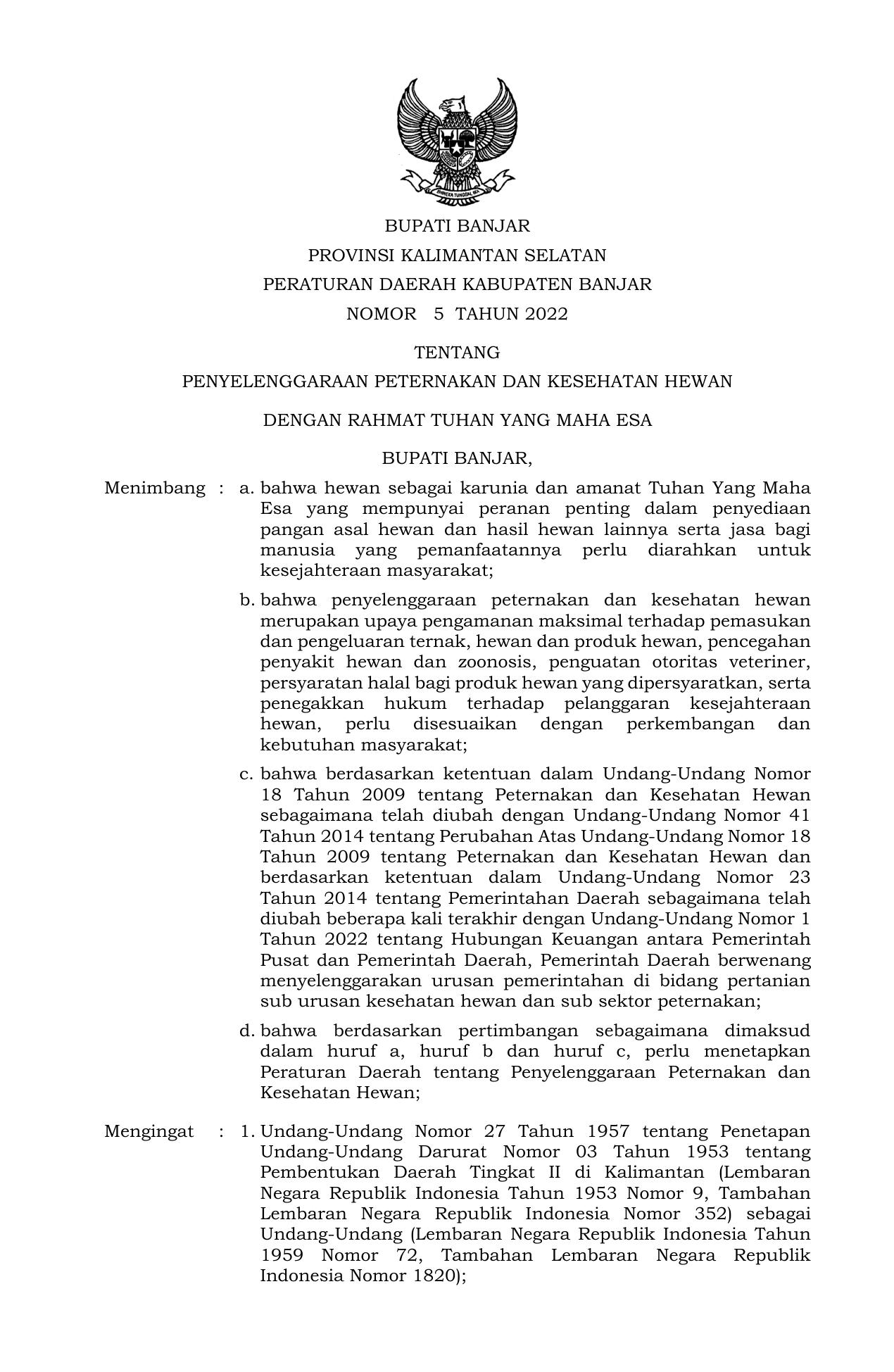 PERDA Nomor 5 Tahun 2022 | Peraturan Daerah Nomor 5 Tahun 2022 tentang PENYELENGGARAAN PETERNAKAN DAN KESEHATAN HEWAN