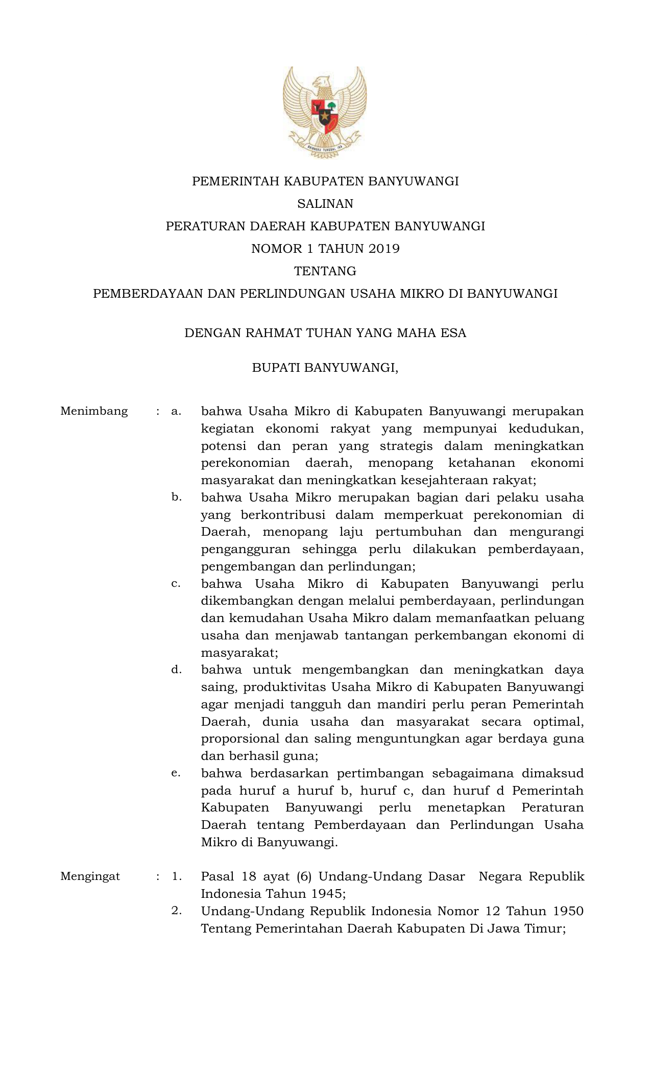 PERDA Nomor 1 Tahun 2019 | Peraturan Daerah Nomor 1 Tahun 2019 tentang PEMBERDAYAAN DAN PERLINDUNGAN USAHA MIKRO DI BANYUWANGI