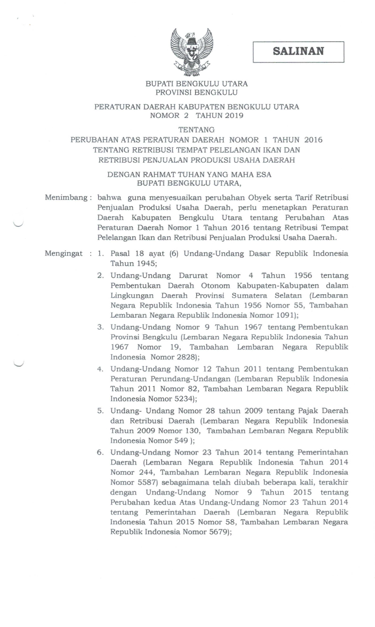 PERDA Nomor 2 Tahun 2019 | Peraturan Daerah Nomor 2 Tahun 2019 tentang Retribusi Tempat Pelelangan Ikan Dan Retribusi Penjualan Produksi Usaha Daerah