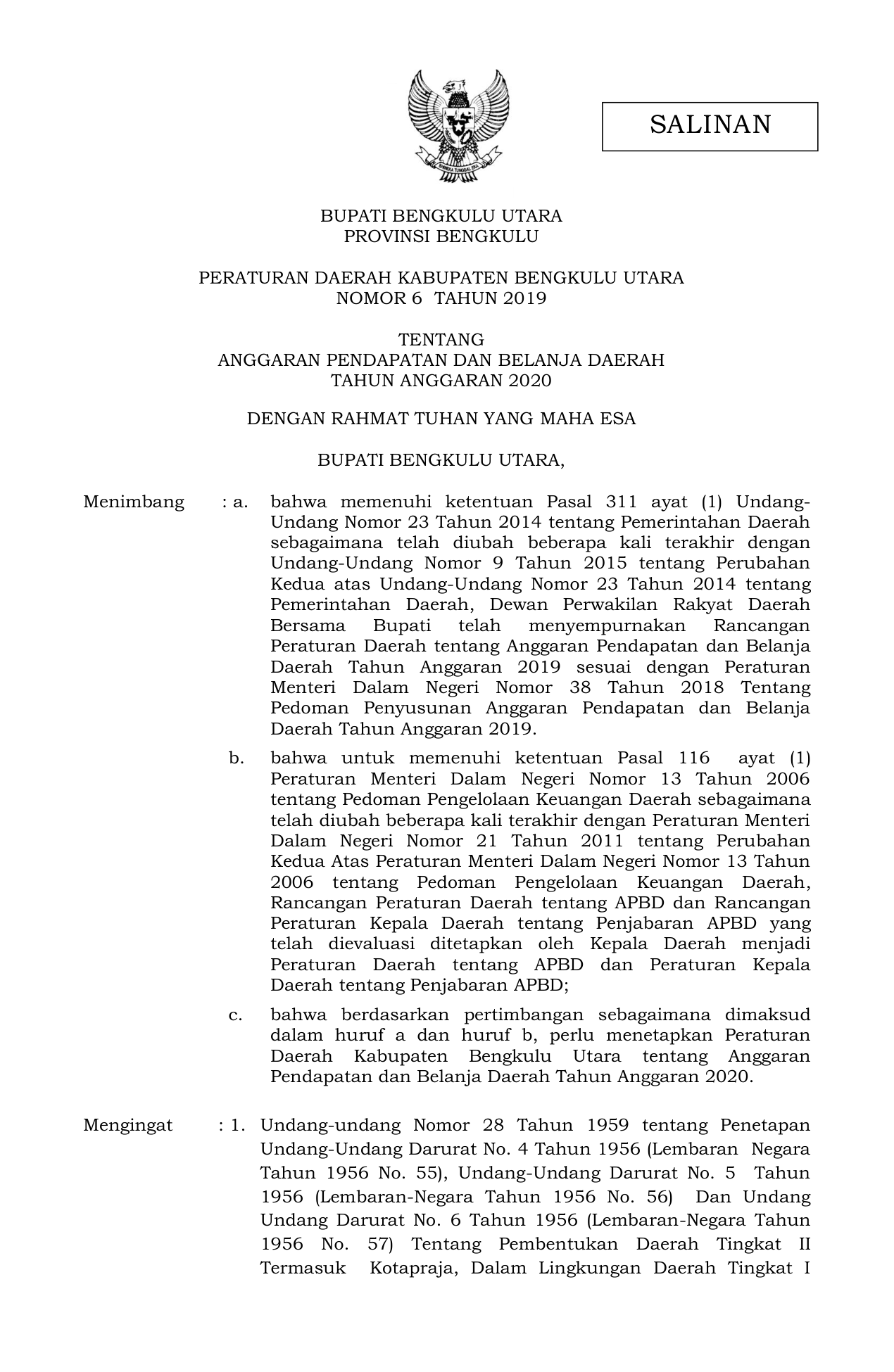 PERDA Nomor 6 Tahun 2019 | Peraturan Daerah Nomor 6 Tahun 2019 tentang Anggaran Pendapatan Dan Belanja Daerah Tahun Anggaran 2020