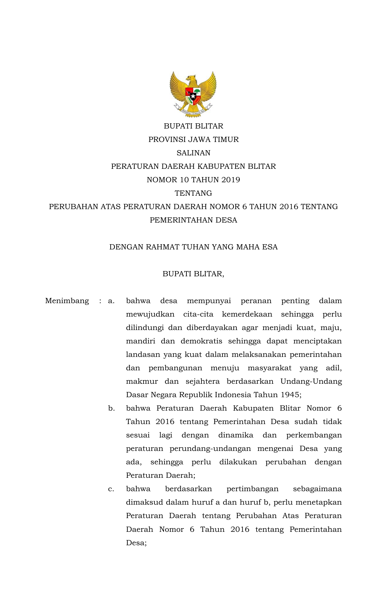 PERDA Nomor 10 Tahun 2019 | Peraturan Daerah Nomor 10 Tahun 2019 tentang Perubahan Atas Peraturan Daerah Nomor 6 Tahun 2016 Tentang Pemerintahan Desa