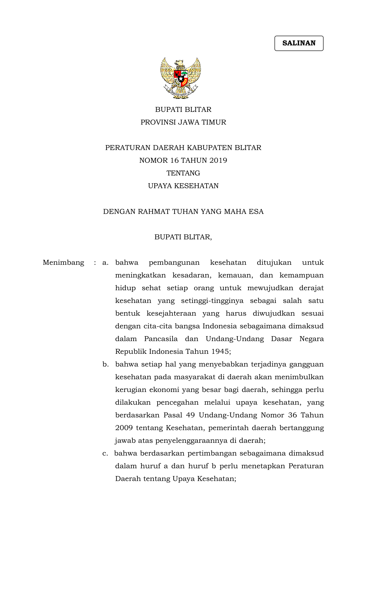 PERDA Nomor 16 Tahun 2019 | Peraturan Daerah Nomor 16 Tahun 2019 tentang Upaya Kesehatan
