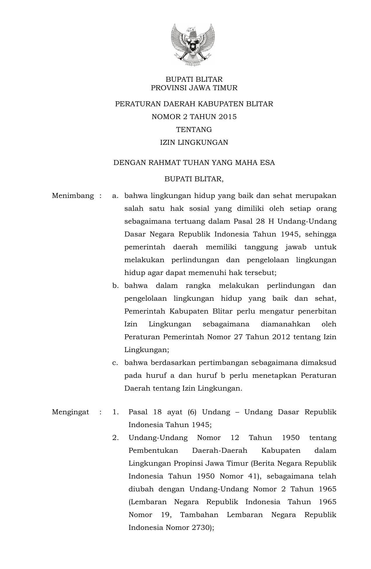 PERDA Nomor 2 Tahun 2015 | Peraturan Daerah Nomor 2 Tahun 2015 tentang IZIN LINGKUNGAN