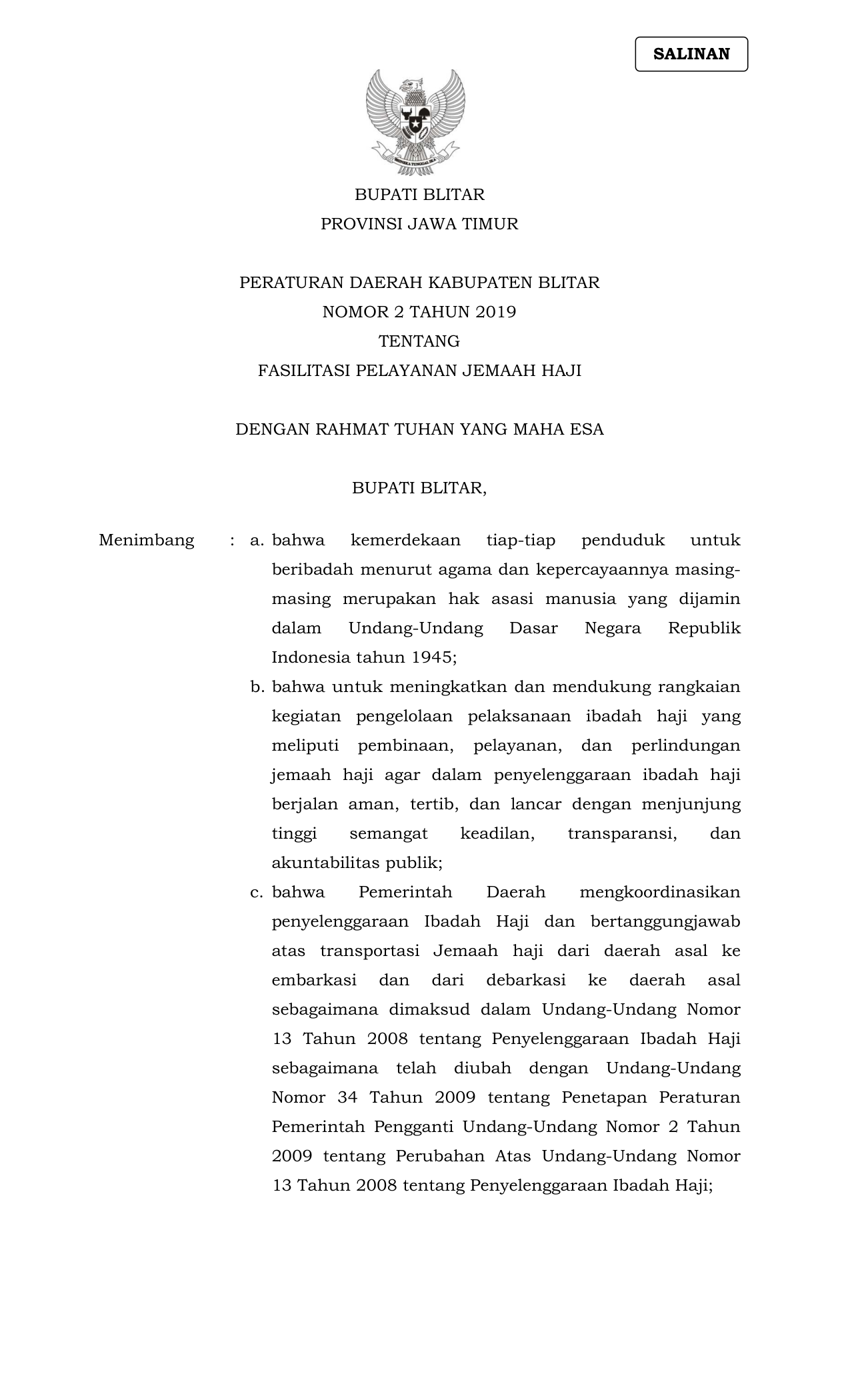 PERDA Nomor 2 Tahun 2019 | Peraturan Daerah Nomor 2 Tahun 2019 tentang Fasilitasi Pelayanan Jamaah Haji