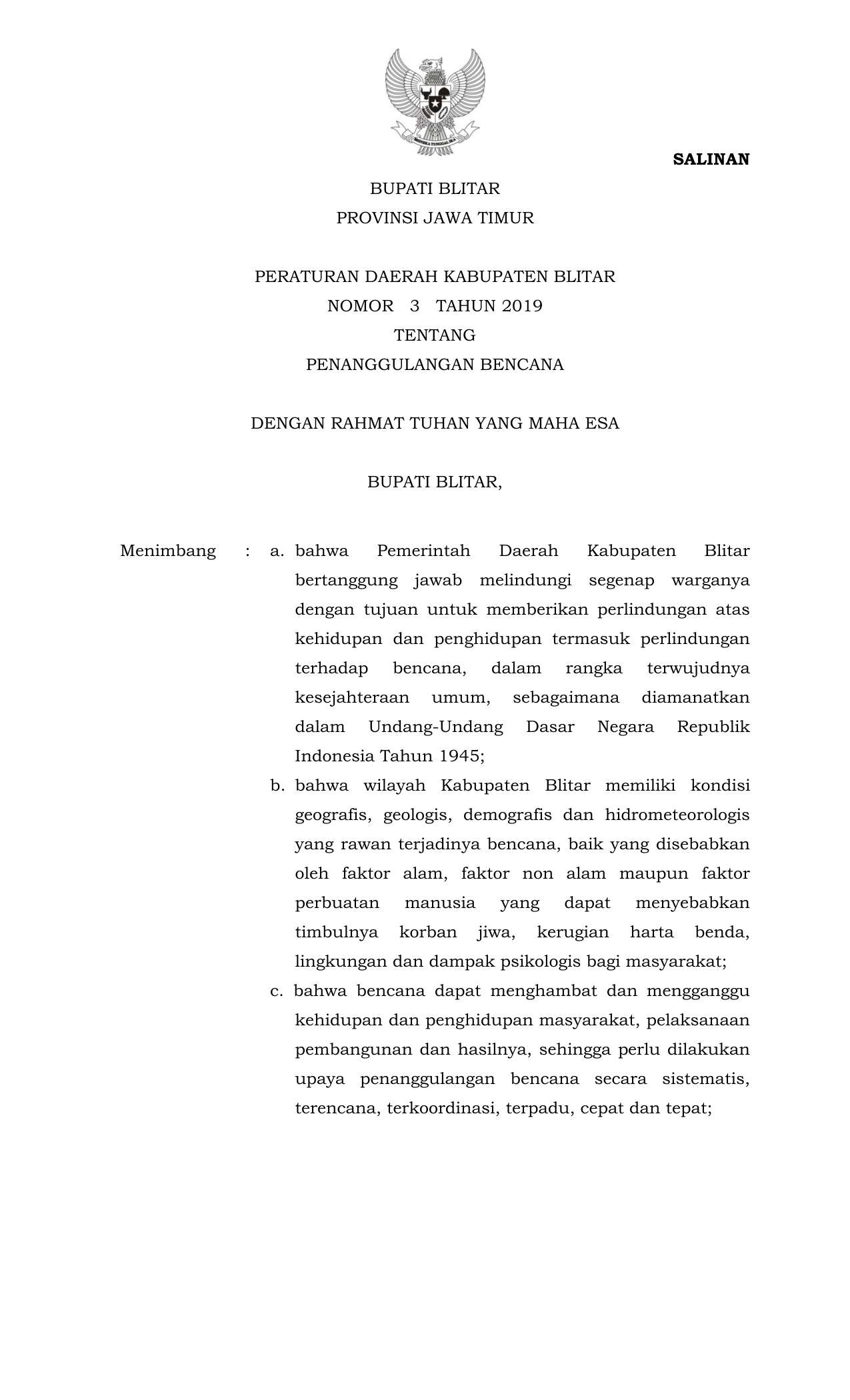 PERDA Nomor 3 Tahun 2019 | Peraturan Daerah Nomor 3 Tahun 2019 tentang Penanggulangan Bencana