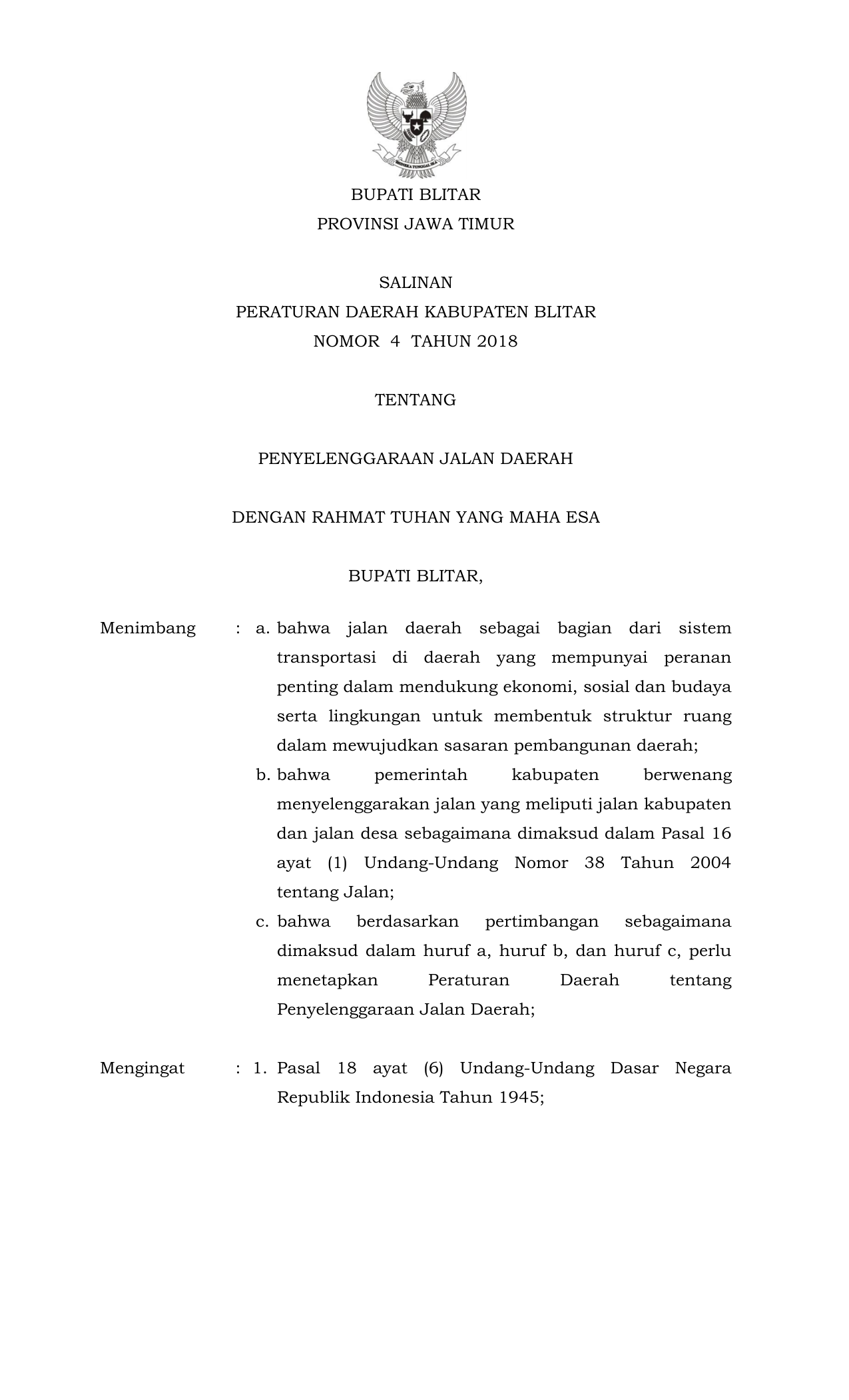 PERDA Nomor 4 Tahun 2018 | Peraturan Daerah Nomor 4 Tahun 2018 tentang Penyelenggaraan Jalan Daerah