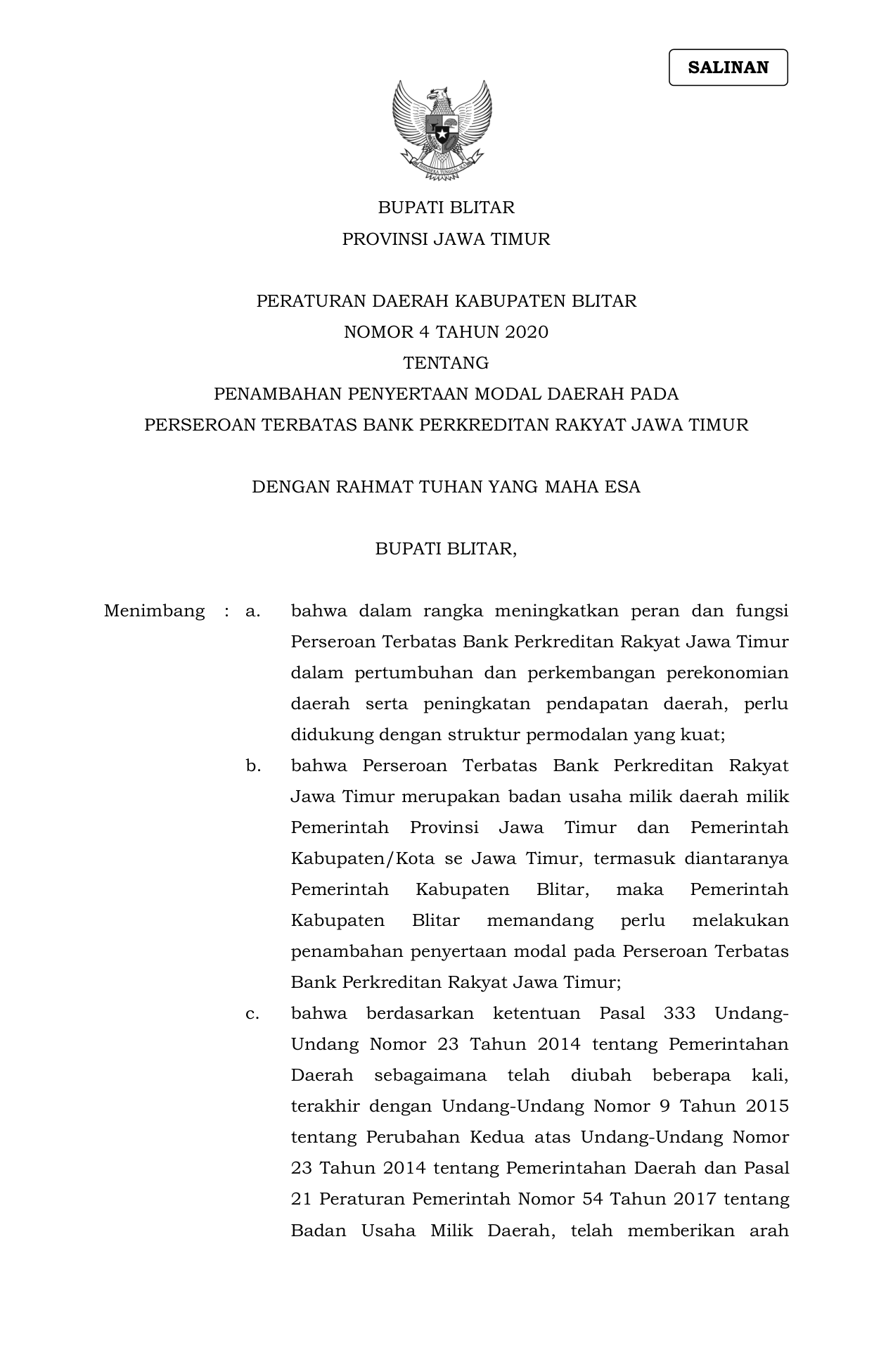 PERDA Nomor 4 Tahun 2020 | Peraturan Daerah Nomor 4 Tahun 2020 tentang Tentang Penambahan Penyertaan Modal Daerah Pada Perseroan Terbatas Bank Perkreditan Rakyat Jawa Timur