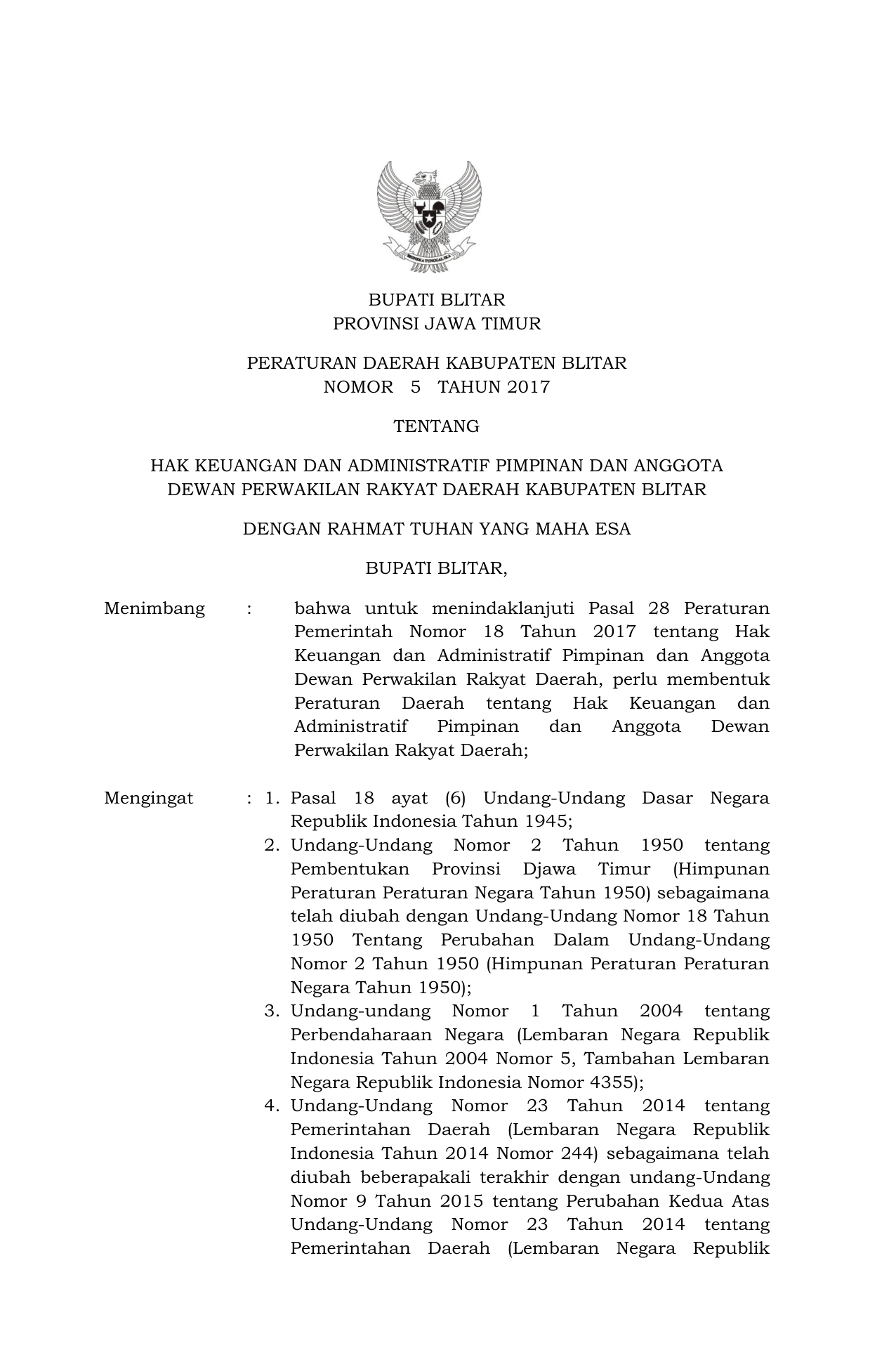 PERDA Nomor 5 Tahun 2017 | Peraturan Daerah Nomor 5 Tahun 2017 tentang Hak Keuangan Dan Administratif Pimpinan Dan Anggota Dewan Perwakilan Rakyat Daerah Kabupaten Blitar