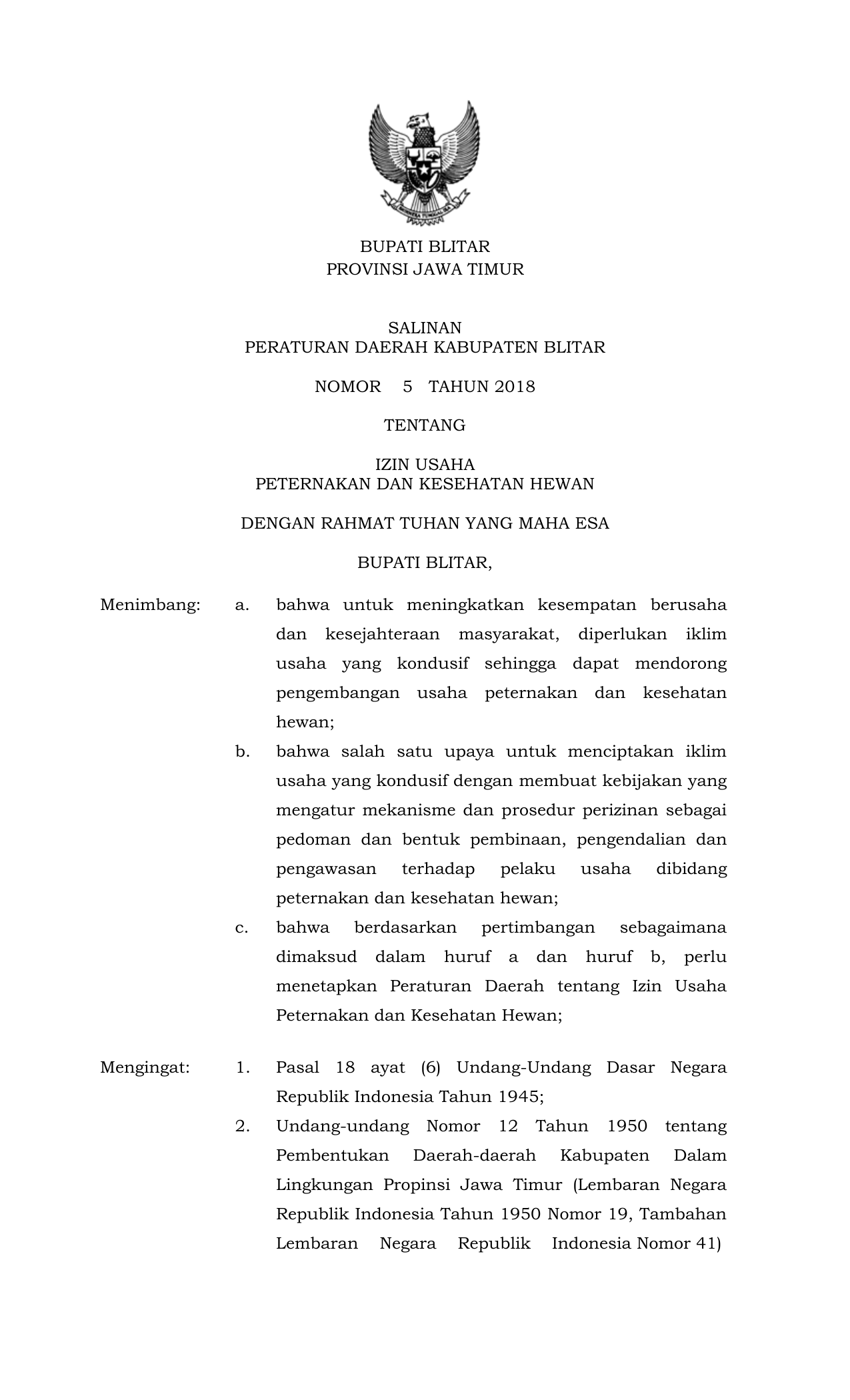 PERDA Nomor 5 Tahun 2018 | Peraturan Daerah Nomor 5 Tahun 2018 tentang Izin Usaha Peternakan Dan Kesehatan Hewan