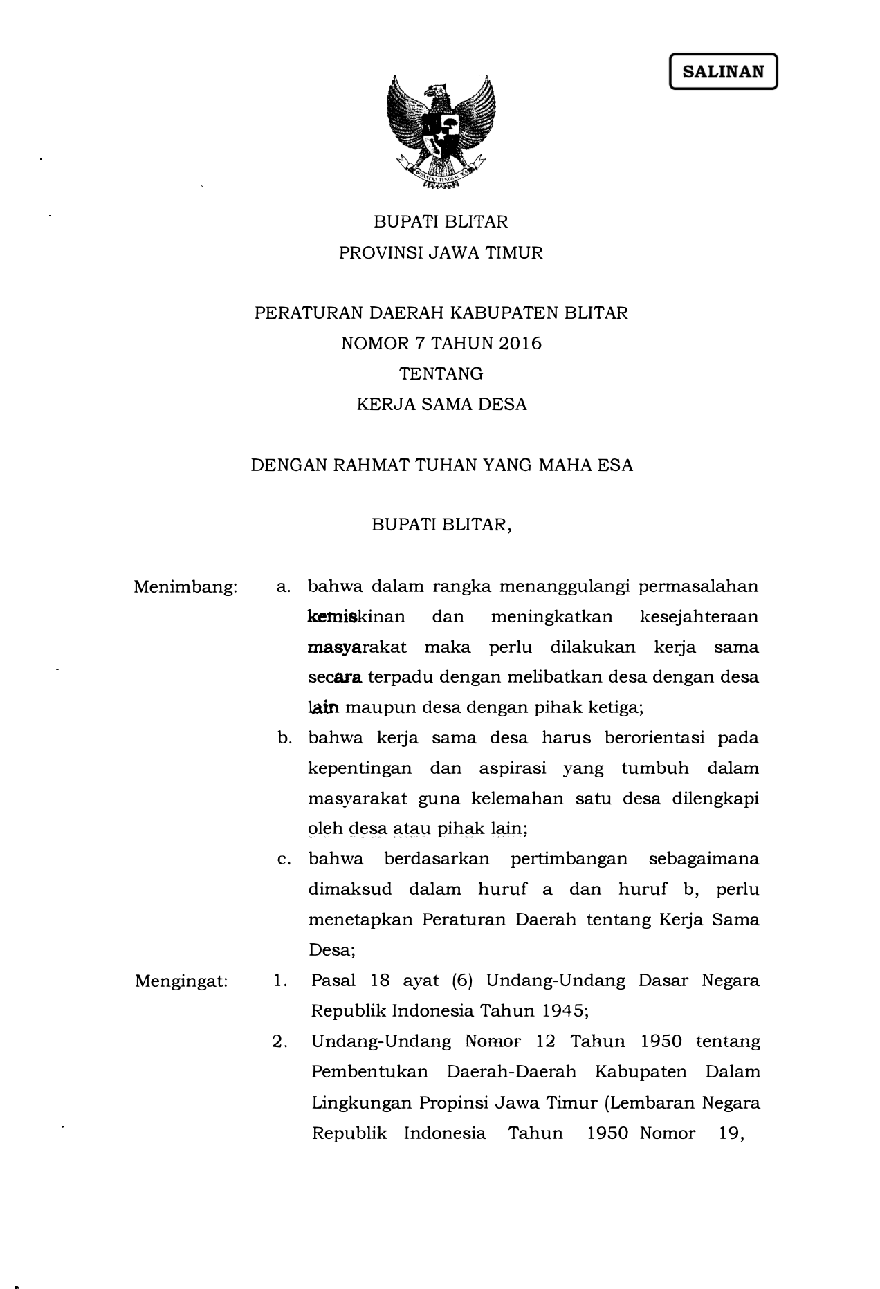 PERDA Nomor 7 Tahun 2016 | Peraturan Daerah Nomor 7 Tahun 2016 tentang KERJA SAMA DESA