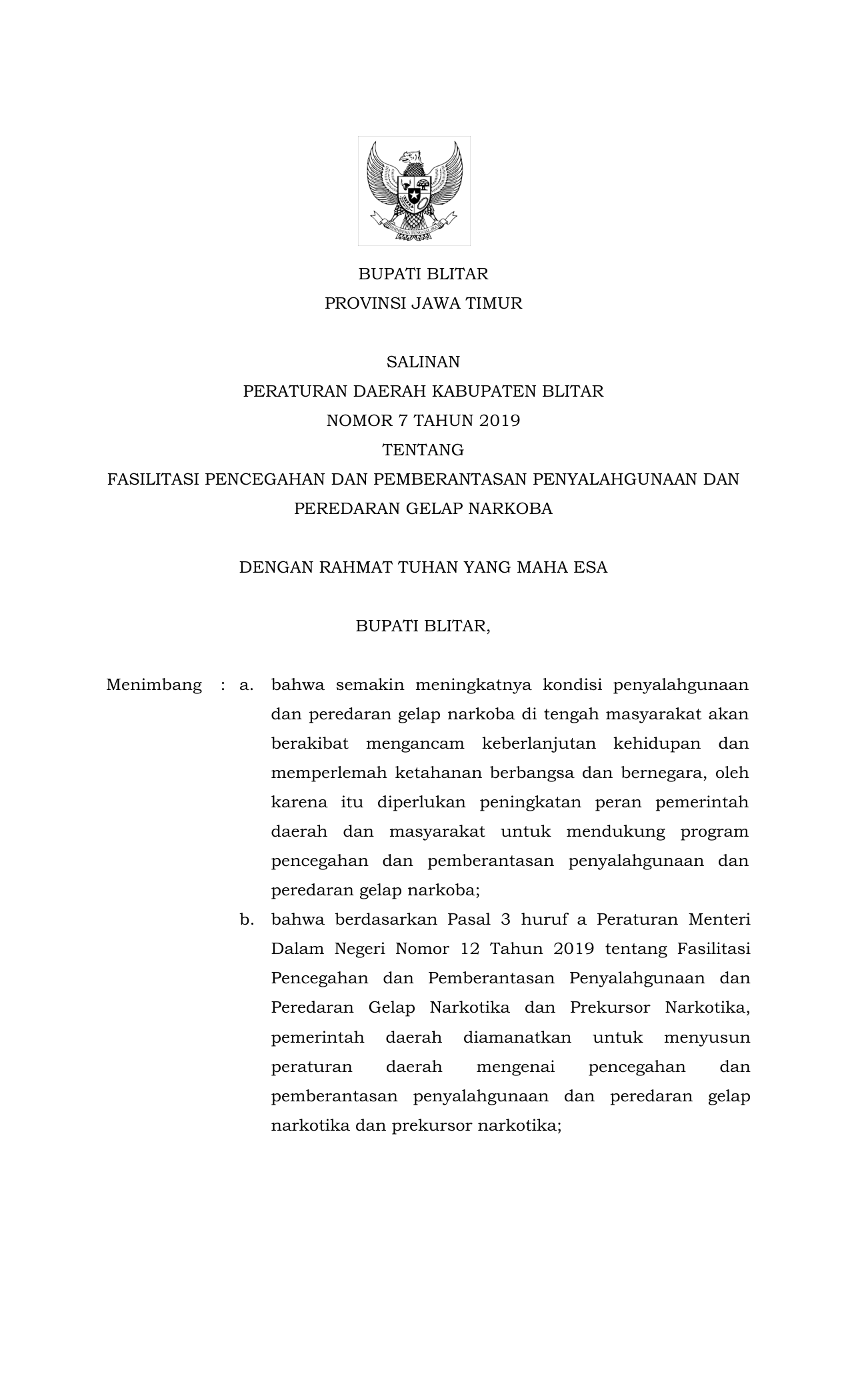 PERDA Nomor 7 Tahun 2019 | Peraturan Daerah Nomor 7 Tahun 2019 tentang Fasilitasi Pencegahan Dan Pemberantasan Penyalahgunaan Dan Peredaran Gelap Narkoba
