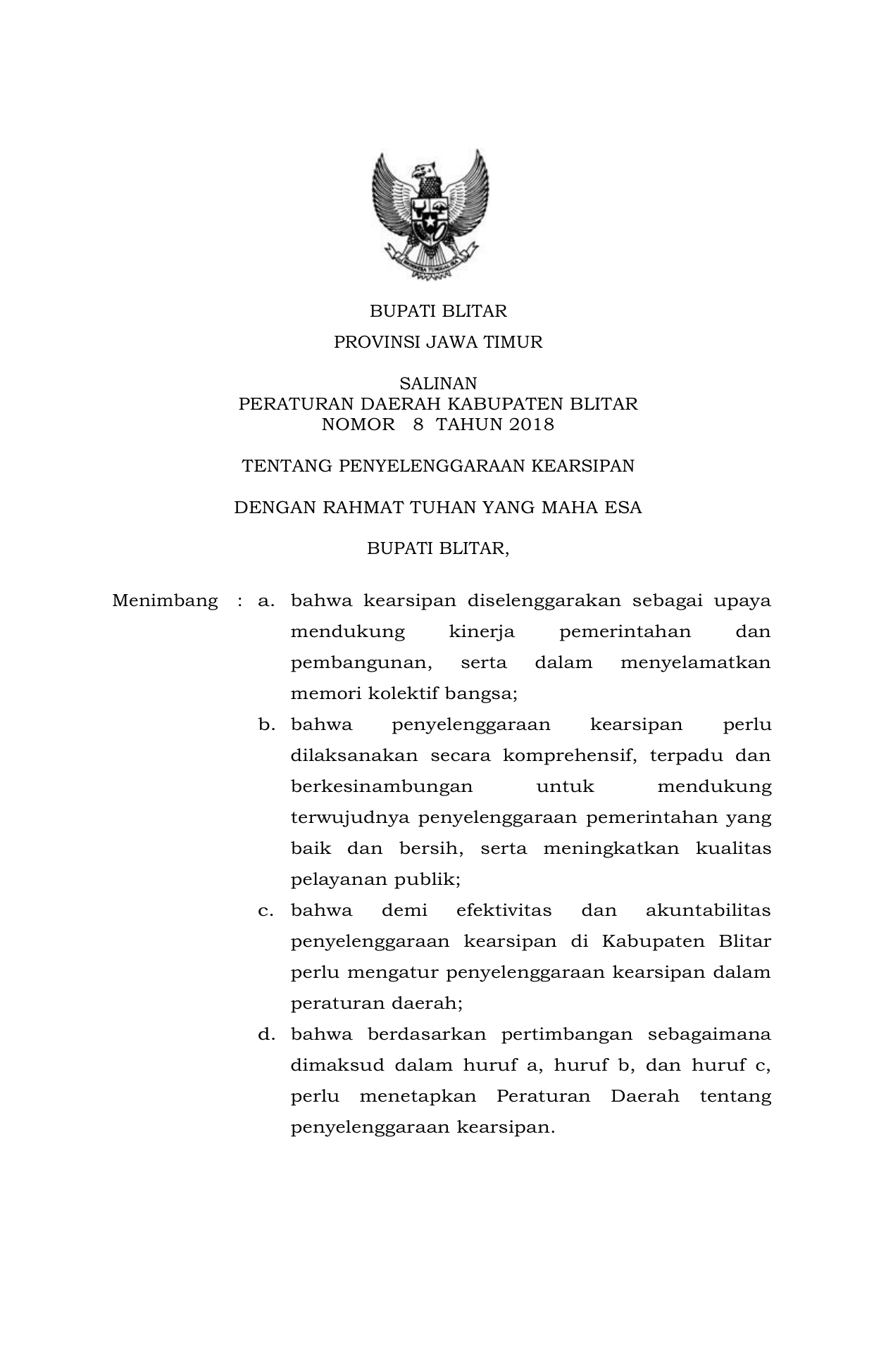 PERDA Nomor 8 Tahun 2018 | Peraturan Daerah Nomor 8 Tahun 2018 tentang Penyelenggaraan Kearsipan