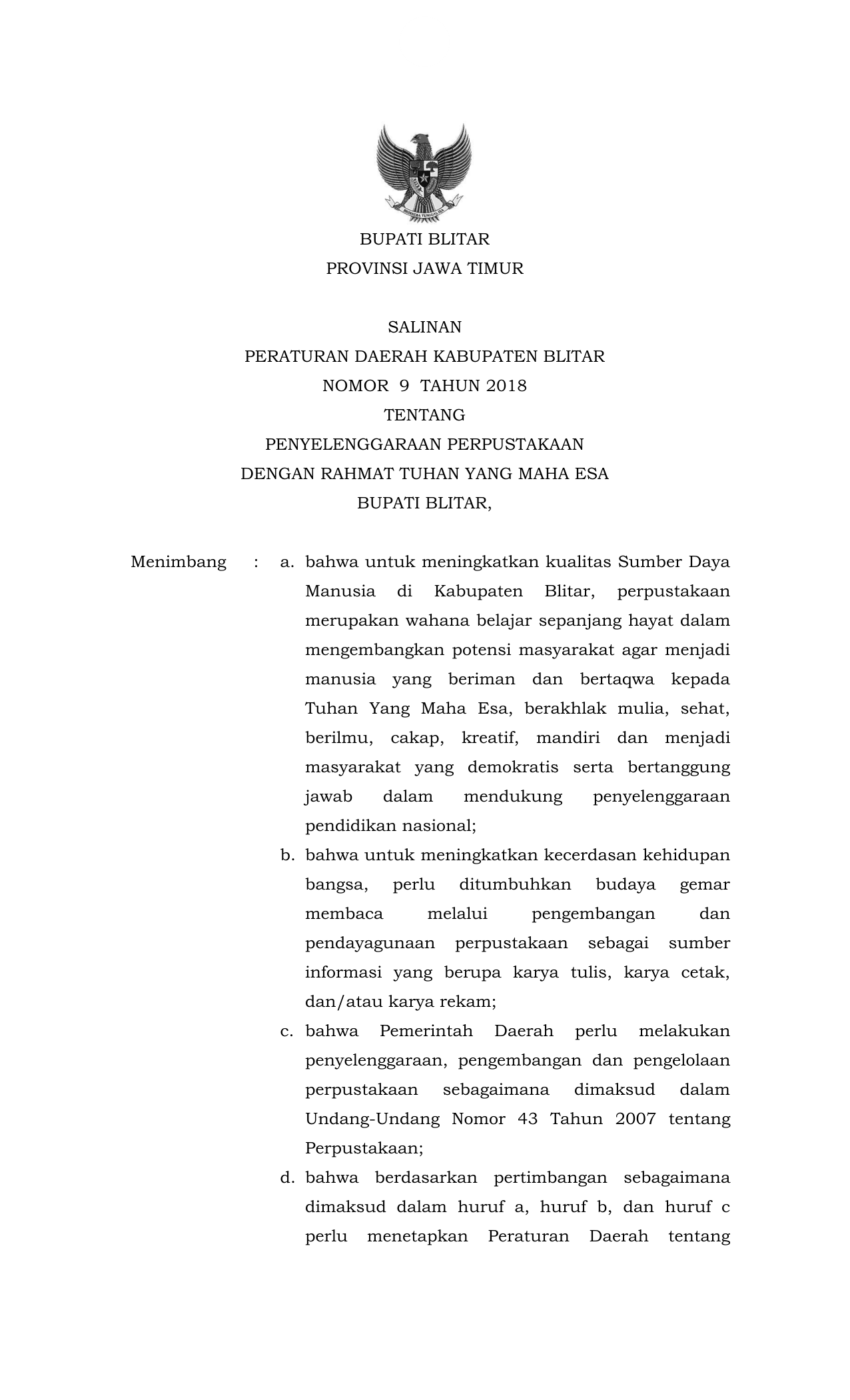 PERDA Nomor 9 Tahun 2018 | Peraturan Daerah Nomor 9 Tahun 2018 tentang Penyelenggaraan Perpustakaan