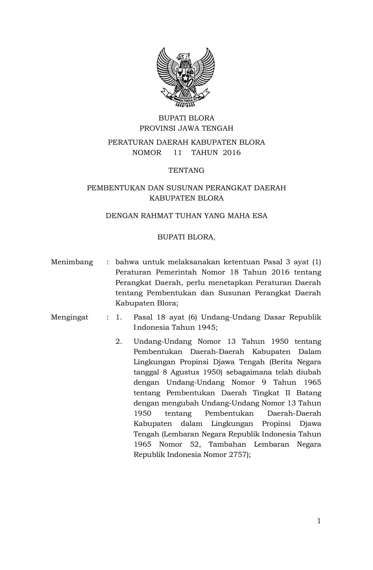 PERDA Nomor 11 Tahun 2016 | Peraturan Daerah Nomor 11 Tahun 2016 tentang Pembentukan dan Susunan Perangkat Daerah Kabupaten Blora