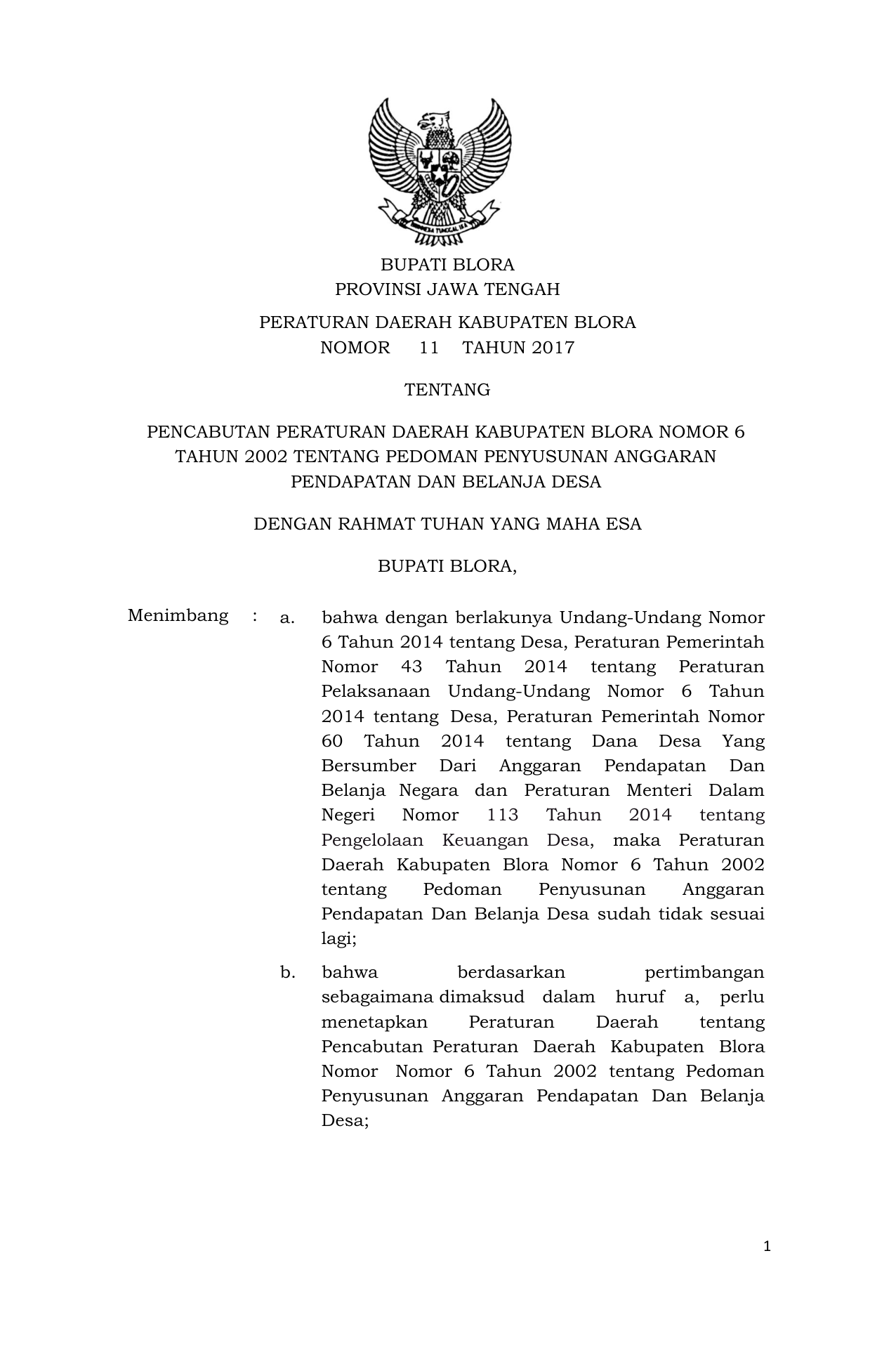 PERDA Nomor 11 Tahun 2017 | Peraturan Daerah Nomor 11 Tahun 2017 tentang Pencabutan Perda Kab. Blora Nomor 6 Tahun 2002 tentang Pedoman Penyusunan Anggaran Pendapatan Dan Belanja Desa