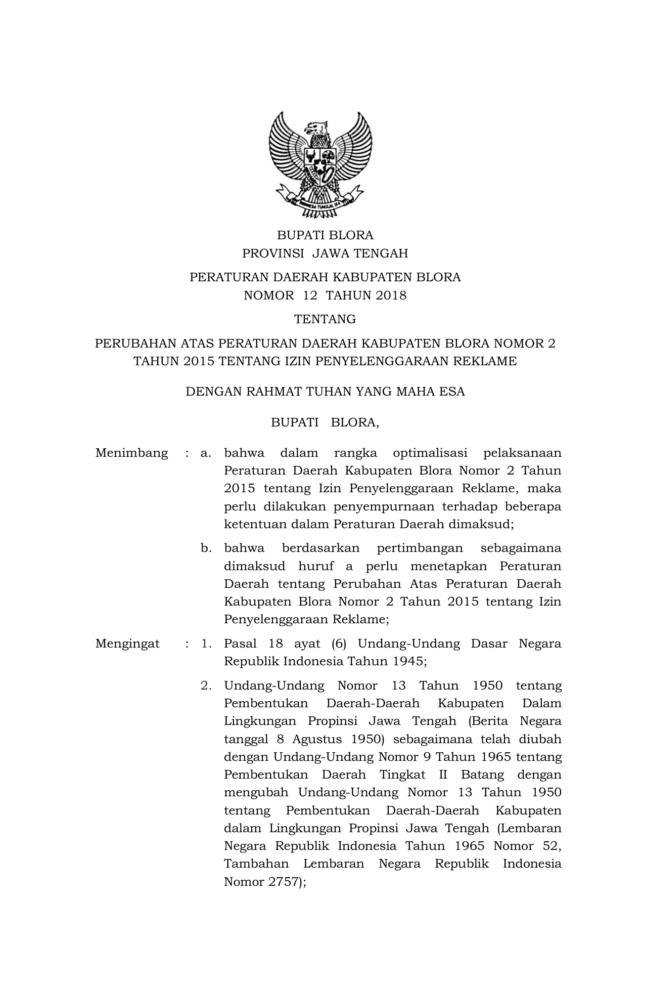 PERDA Nomor 12 Tahun 2018 | Peraturan Daerah Nomor 12 Tahun 2018 tentang Perubahan Atas Peraturan Daerah Kabupaten Blora Nomor 2 Tahun 2015 tentang Izin Penyelenggaraan Reklame