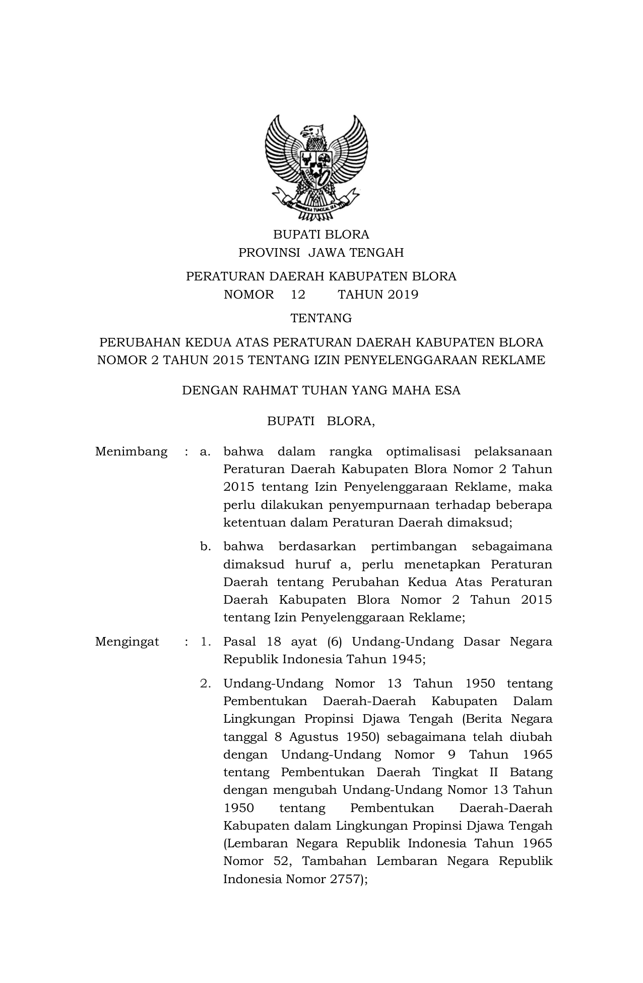 PERDA Nomor 12 Tahun 2019 | Peraturan Daerah Nomor 12 Tahun 2019 tentang Perubahan Kedua Atas Peraturan Daerah Kabupaten Blora Nomor 2 Tahun 2015 tentang Izin Penyelenggaraan Reklame