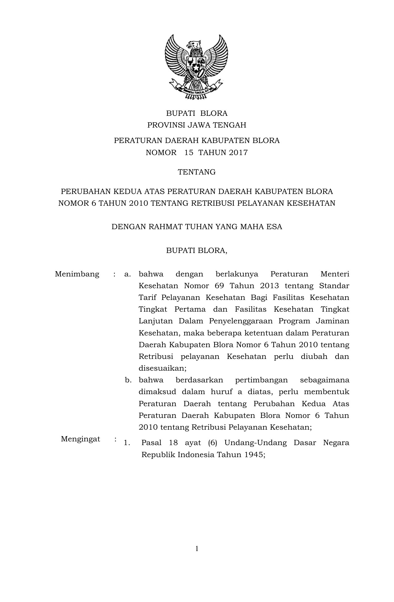 PERDA Nomor 15 Tahun 2017 | Peraturan Daerah Nomor 15 Tahun 2017 tentang Perubahan Kedua Atas Peraturan Daerah Kabupaten Blora Nomor 6 Tahun 2010 tentang Retribusi Pelayanan Kesehatan
