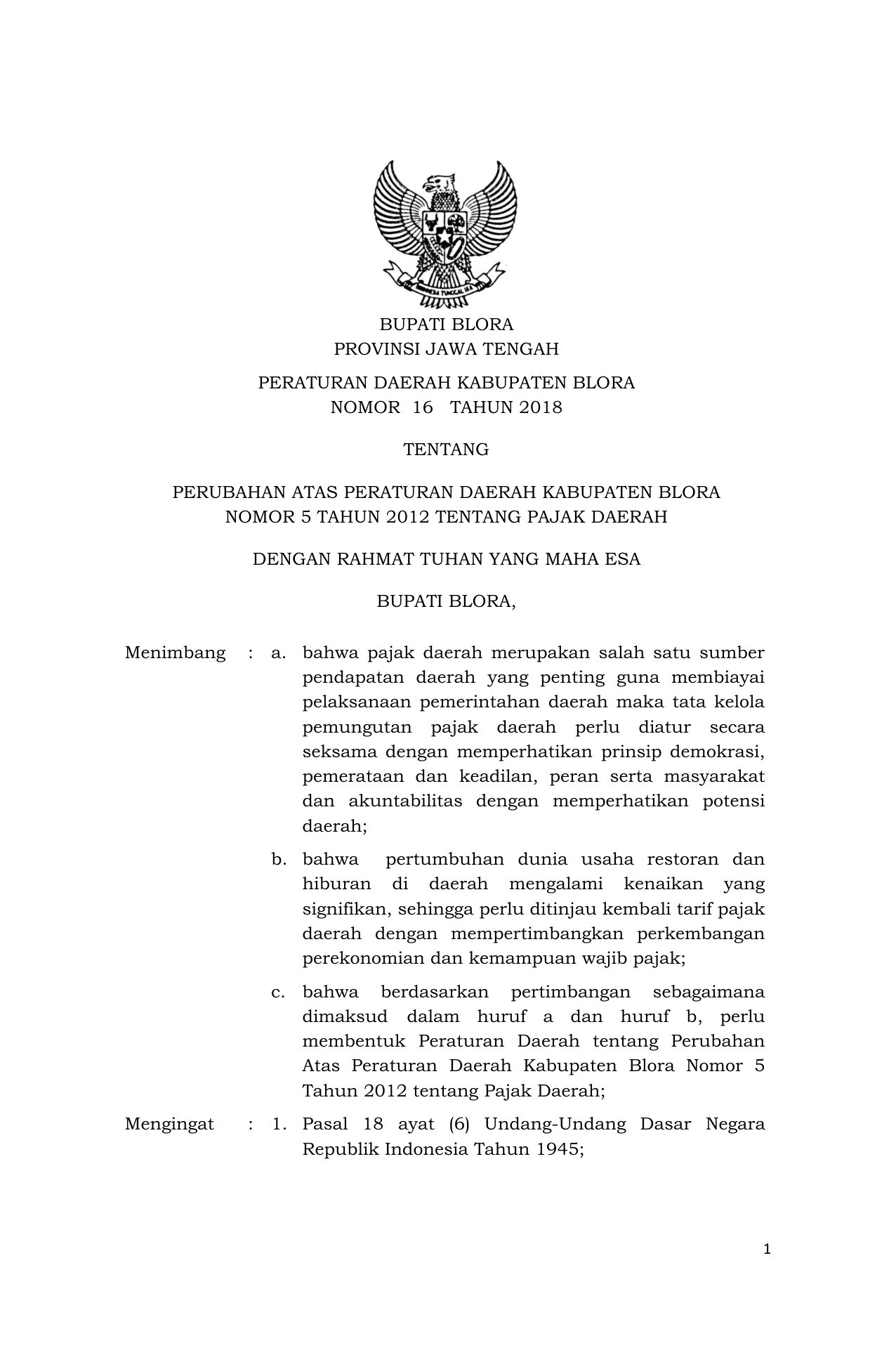 PERDA Nomor 16 Tahun 2018 | Peraturan Daerah Nomor 16 Tahun 2018 tentang Perubahan Atas Peraturan Daerah Kabupaten Blora Nomor 5 Tahun 2012 tentang Pajak Daerah
