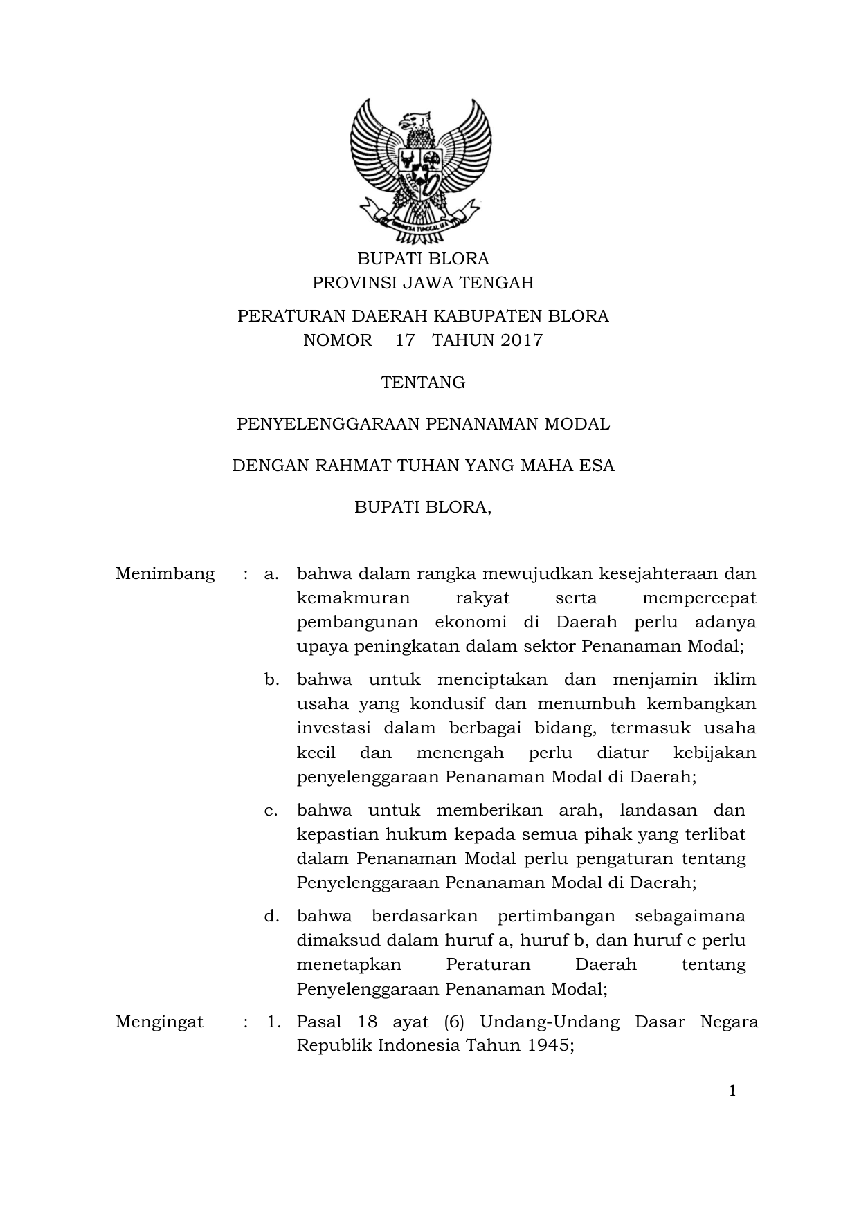 PERDA Nomor 17 Tahun 2017 | Peraturan Daerah Nomor 17 Tahun 2017 tentang PENYELENGGARAAN PENANAMAN MODAL