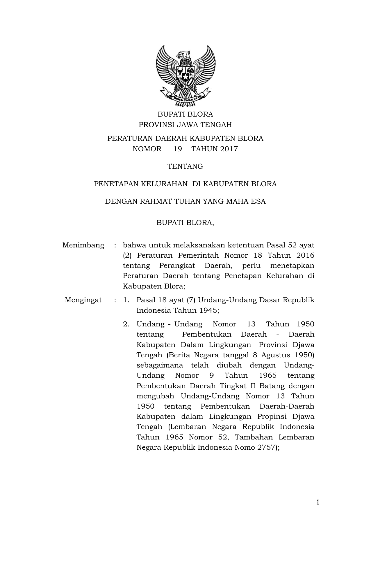 PERDA Nomor 19 Tahun 2017 | Peraturan Daerah Nomor 19 Tahun 2017 tentang Penetapan Kelurahan di Kabupaten Blora
