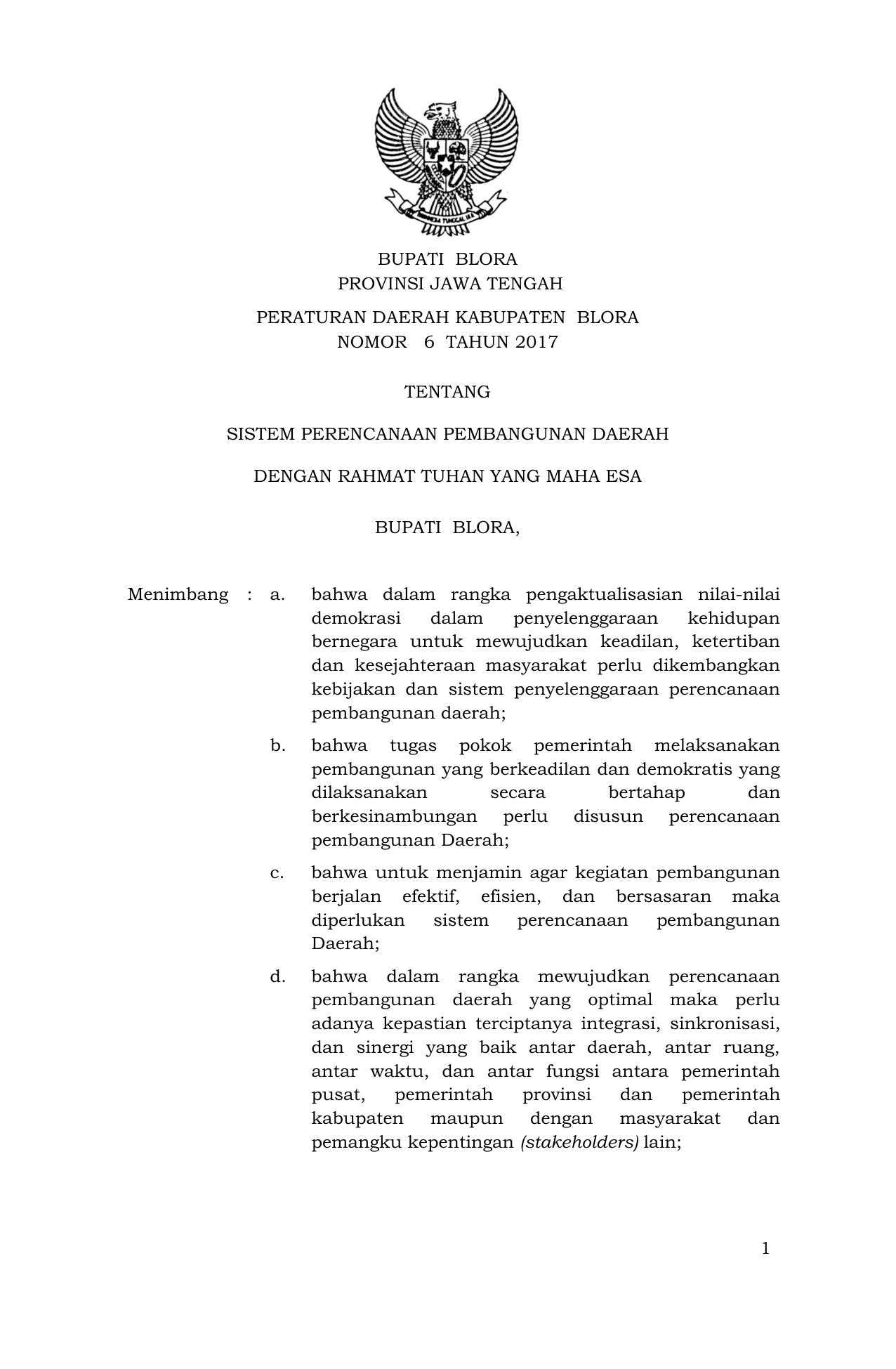 PERDA Nomor 6 Tahun 2017 | Peraturan Daerah Nomor 6 Tahun 2017 tentang Sistem Perencanaan Pembangunan Daerah