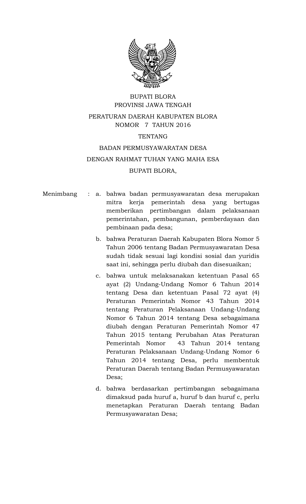 PERDA Nomor 7 Tahun 2016 | Peraturan Daerah Nomor 7 Tahun 2016 tentang Badan Permusyawaratan Desa