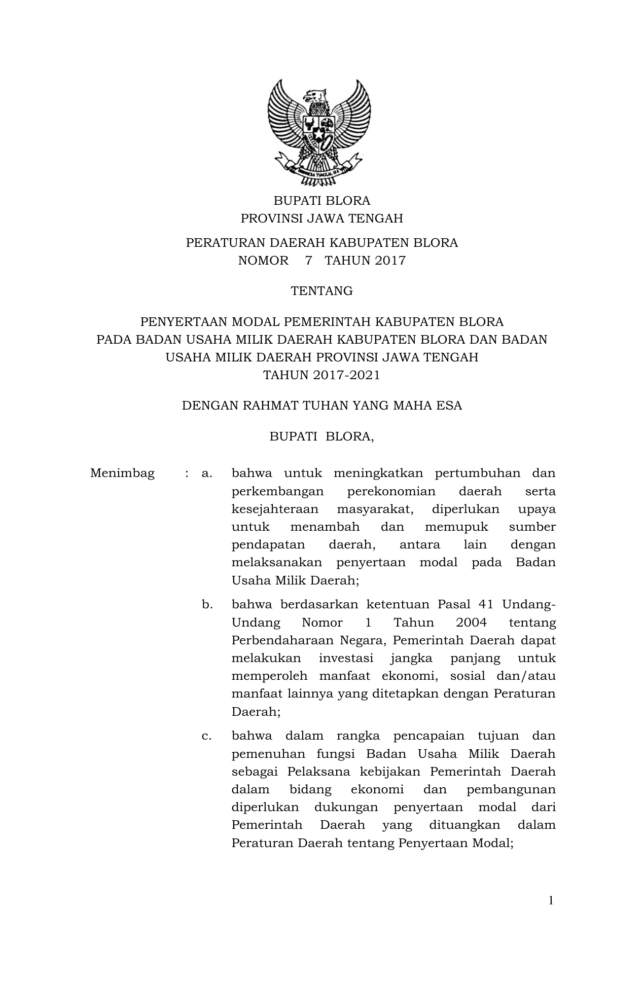 PERDA Nomor 7 Tahun 2017 | Peraturan Daerah Nomor 7 Tahun 2017 tentang Penyertaan Modal Pemerintah Kab. Blora pada BUMD Kab. Blora dan BUMD Provinsi Jawa Tengah Th. 2017-2021
