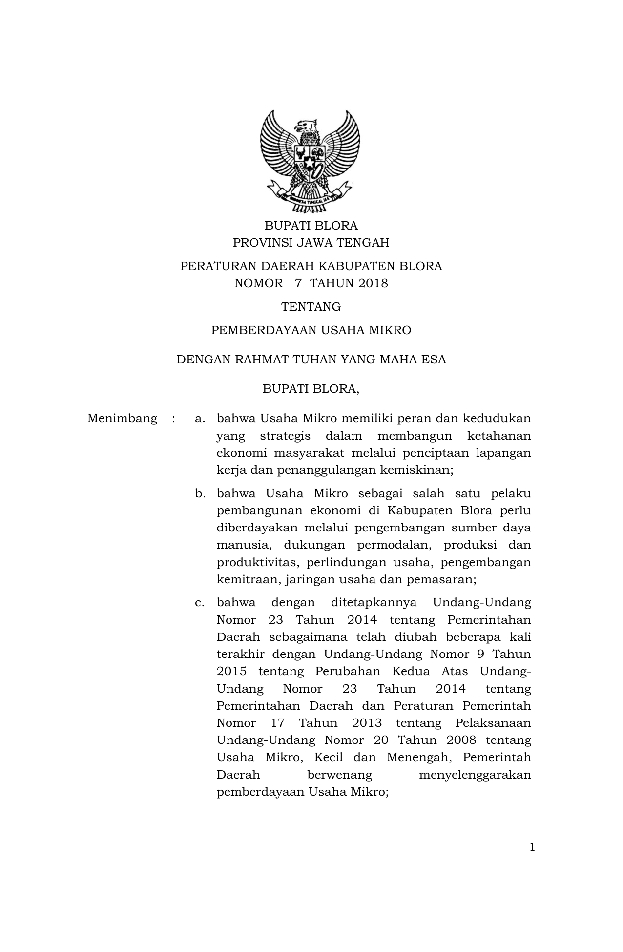 PERDA Nomor 7 Tahun 2018 | Peraturan Daerah Nomor 7 Tahun 2018 tentang Pemberdayaan Usaha Mikro